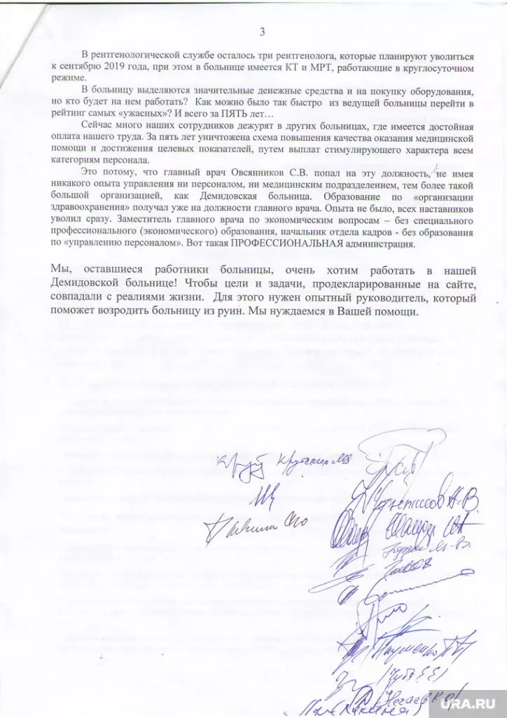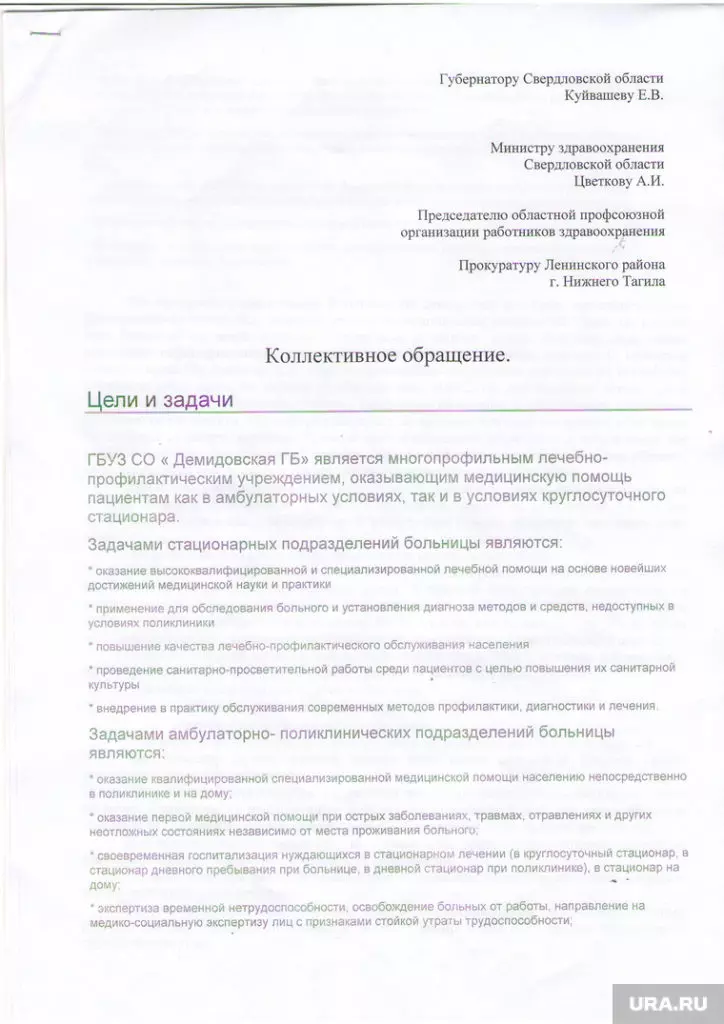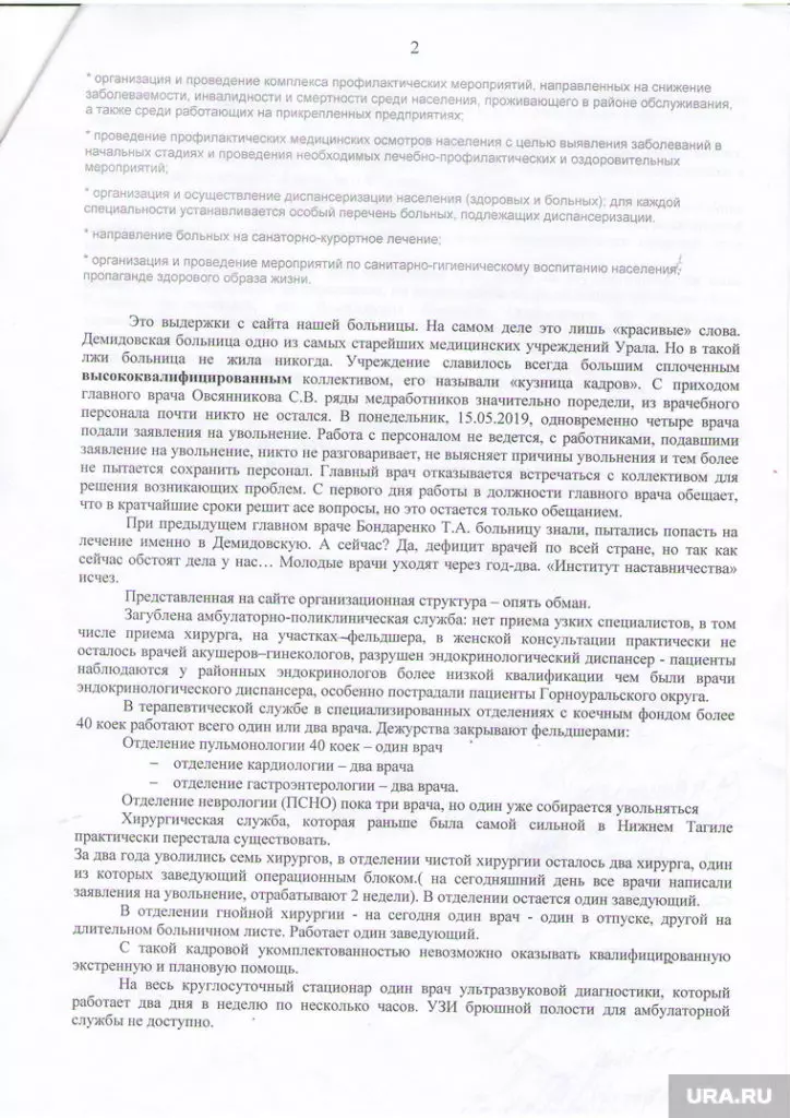 Такое увеличение нагрузки в ГКБ №1 произошло после того, как из другой больницы Нижнего Тагила, Демидовской, также уволились сотрудники — больных оттуда перераспределили по другим больницам. В начале августа врачи Демидовской больницы обращались к губернатору Свердловской области Евгению Куйвашеву и министру здравоохранения Андрею Цветкову с сообщением о дефиците кадров и массовых увольнениях. В письме говорится: «В терапии на 40 коек работает один врач, дежурства закрывают фельдшерами, в кардиологии два врача, в гастроэнтерологи два врача».