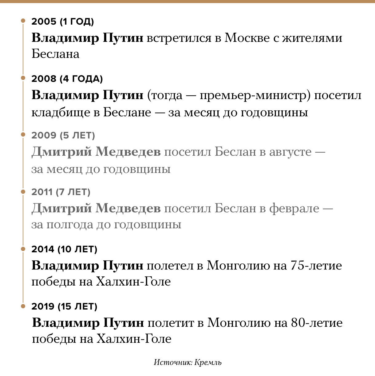 3 сентября в России отмечают День солидарности в борьбе с терроризмом — в годовщину теракта в школе № 1 в Беслане в 2004 году. Президент Владимир Путин приезжал в Беслан только один раз, на следующий день после штурма школы. Дмитрий Медведев на посту президента дважды был в Беслане и возлагал цветы к мемориалу «Древо скорби». В 2019 году, в 15-ю годовщину теракта Владимир Путин, как и пятью годами ранее, отправится в Монголию на празднование юбилея победы над японскими войсками на реке Халхин-Гол. Обновление: впервые стало известно, что в 2008 году Путин приезжал на кладбище в Беслане.