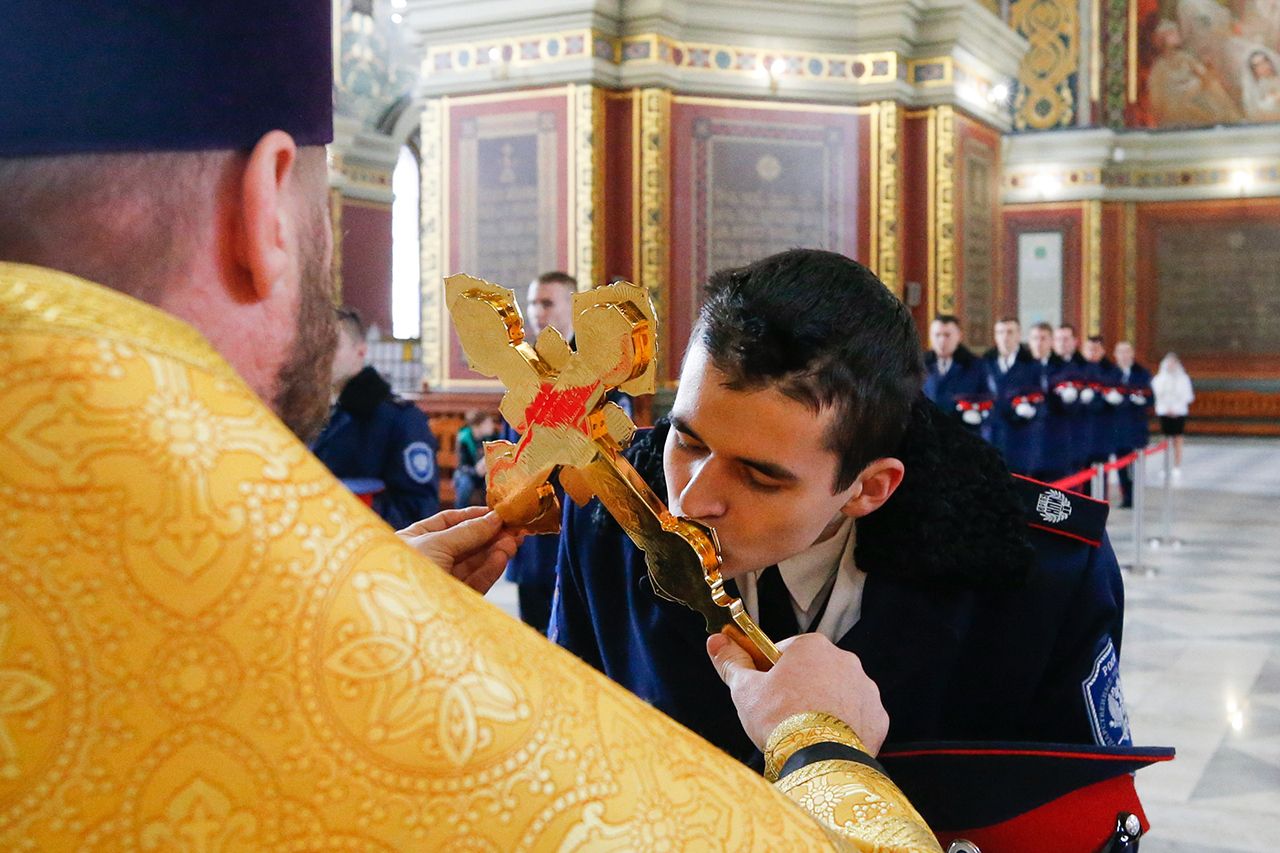 Утвержденный кандидат перед строем казаков зачитывает кодекс казачьей чести — «основанные на исторических традициях общие принципы поведения казаков» — и принимает присягу во время религиозного обряда в храме. («Предварительная забота атаманов выяснить, все ли принимающие присягу казаки крещены в православии», уточняются в документе совета при президенте.)