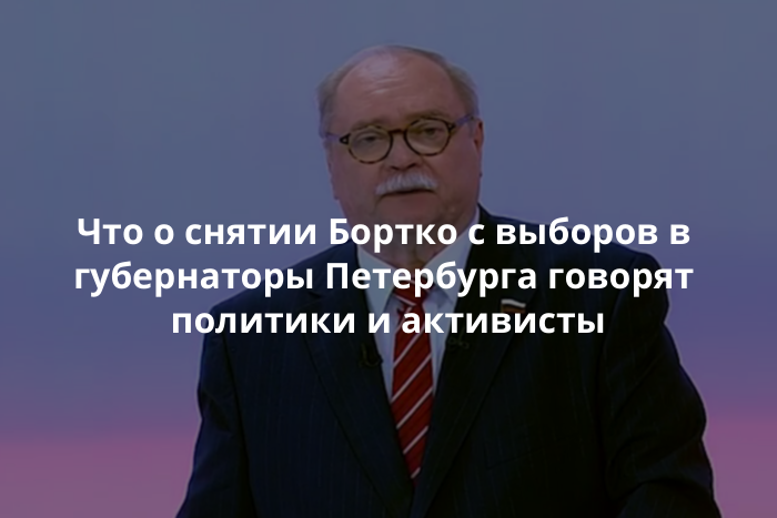 Вечером 30 августа в эфире телеканала «Санкт-Петербург» Владимир Бортко заявил, что снимает свою кандидатуру с выборов в губернаторы. По опросам ВЦИОМ он был вторым по популярности кандидатом. Но при этом его называли «предварительно согласованным» для выборов, на которых власти ждут победы Беглова.