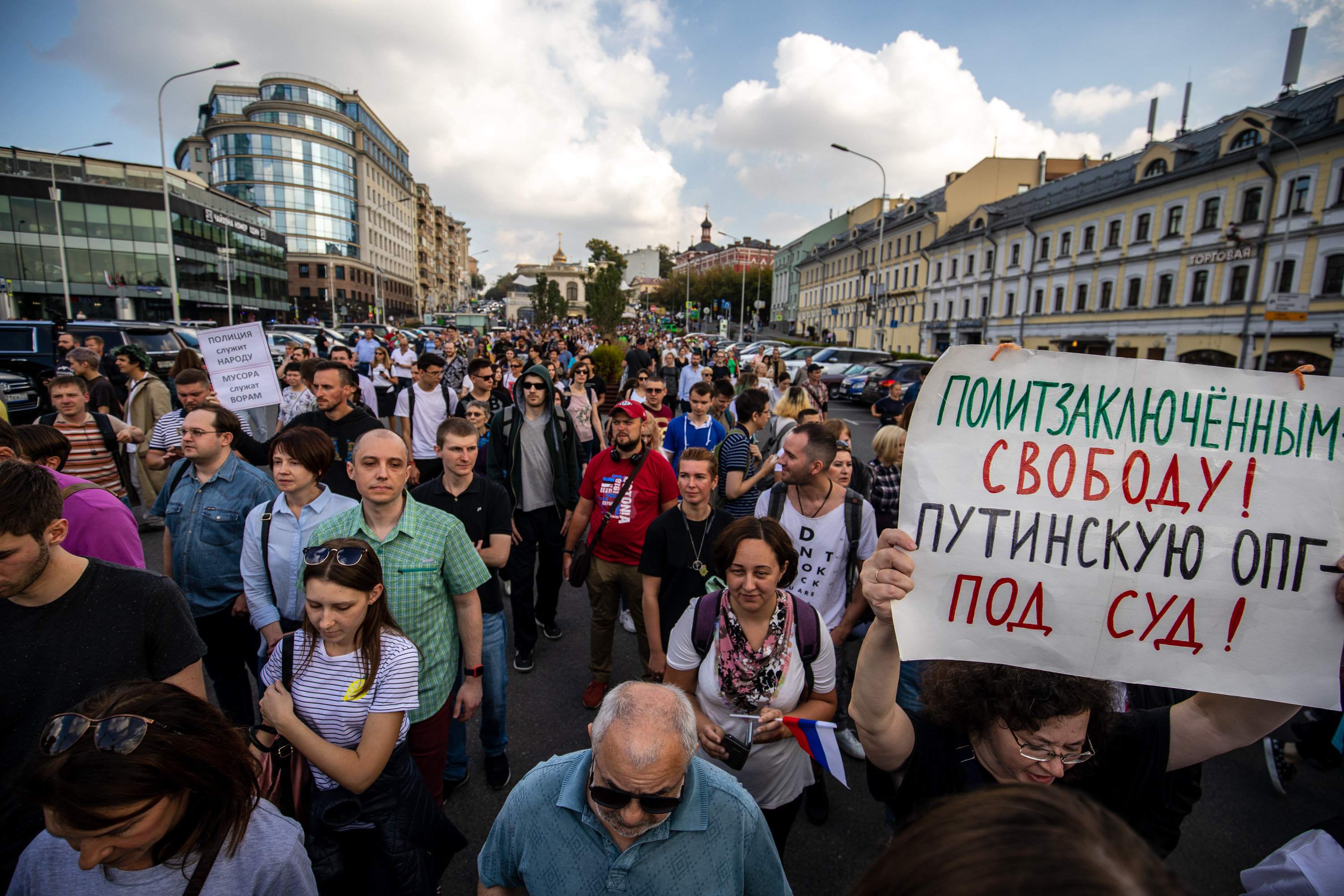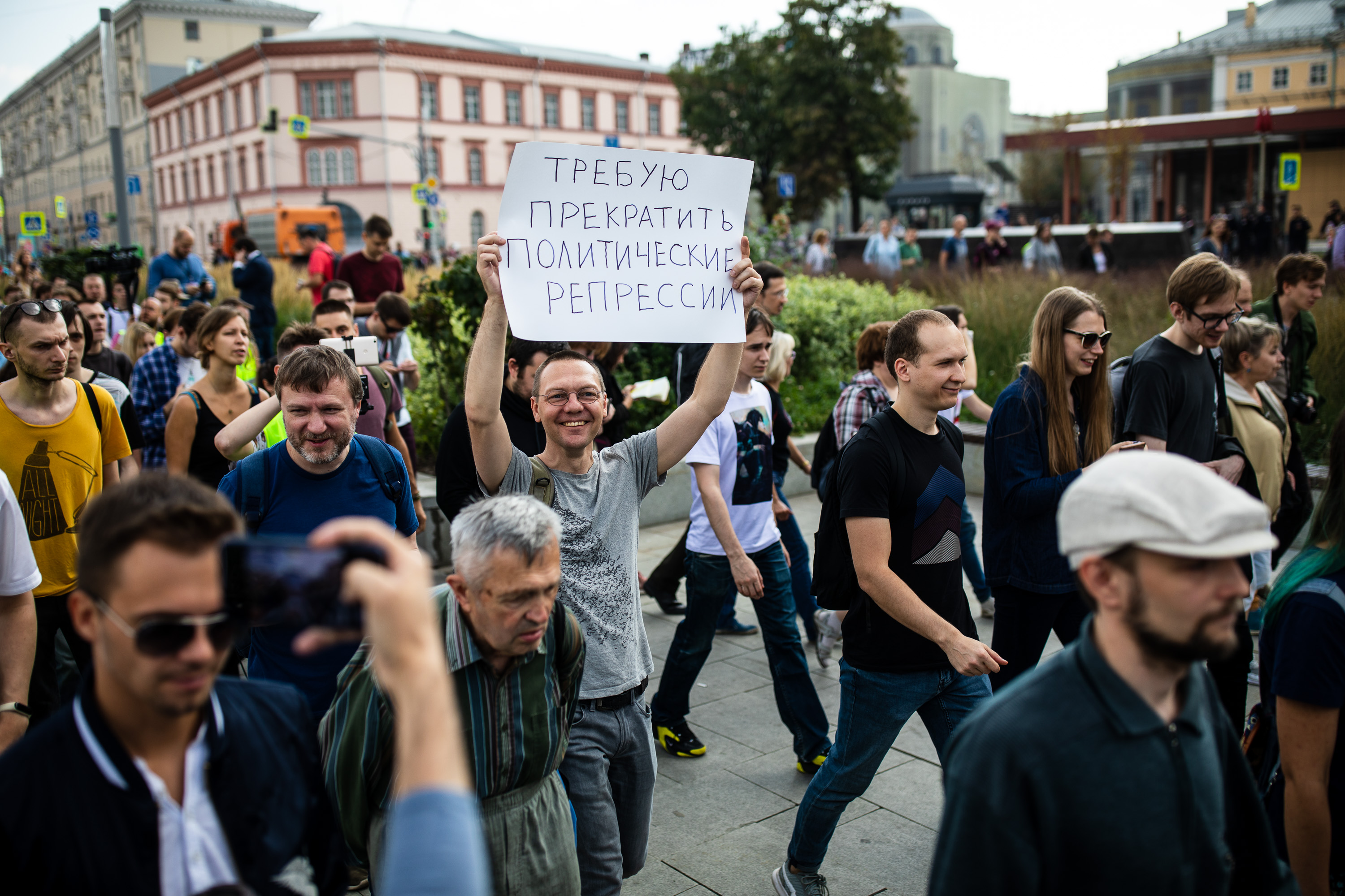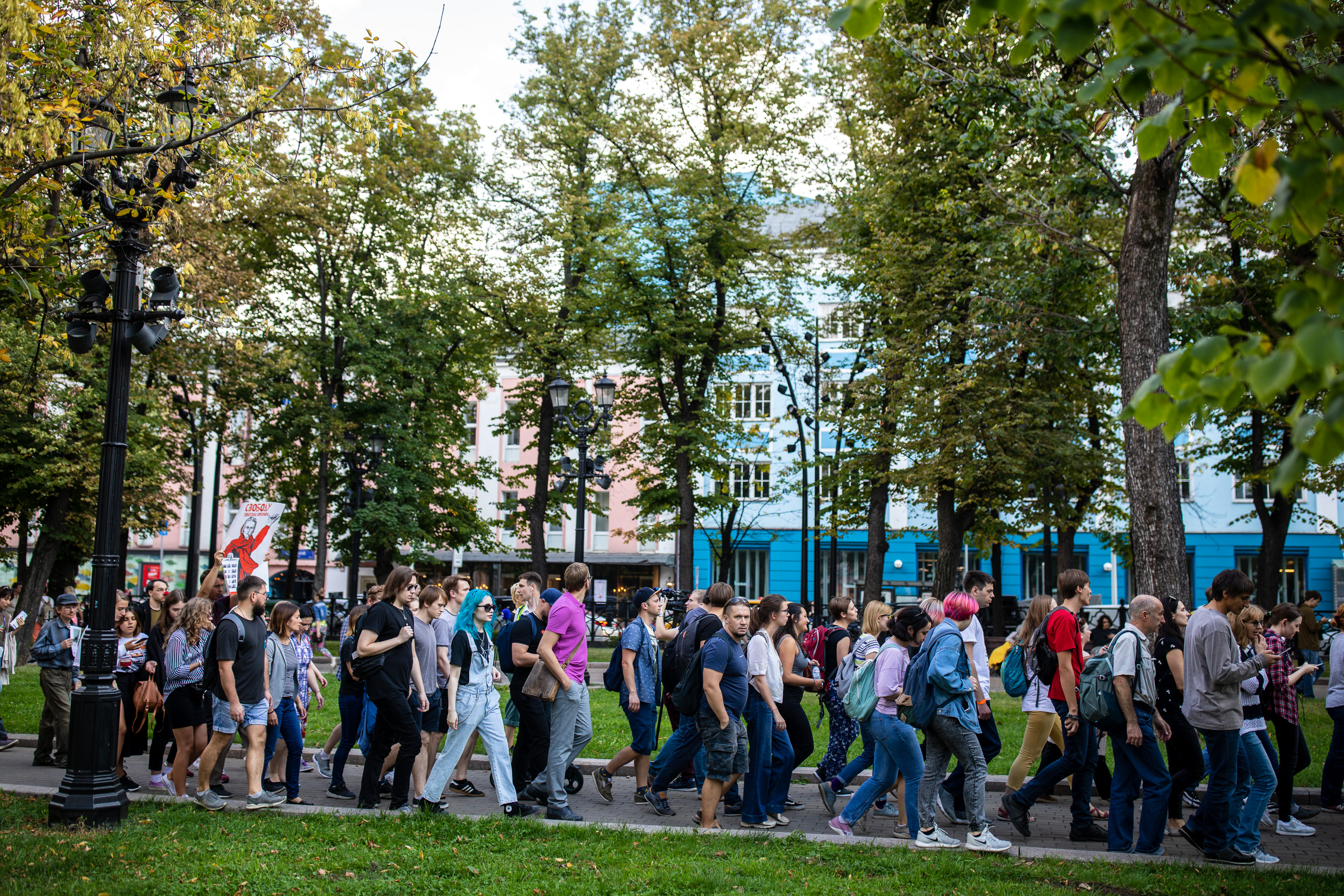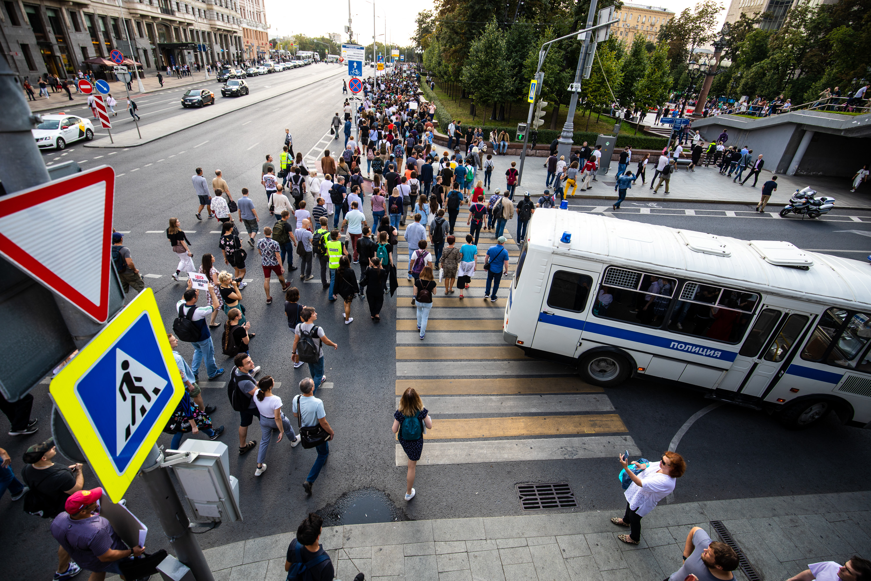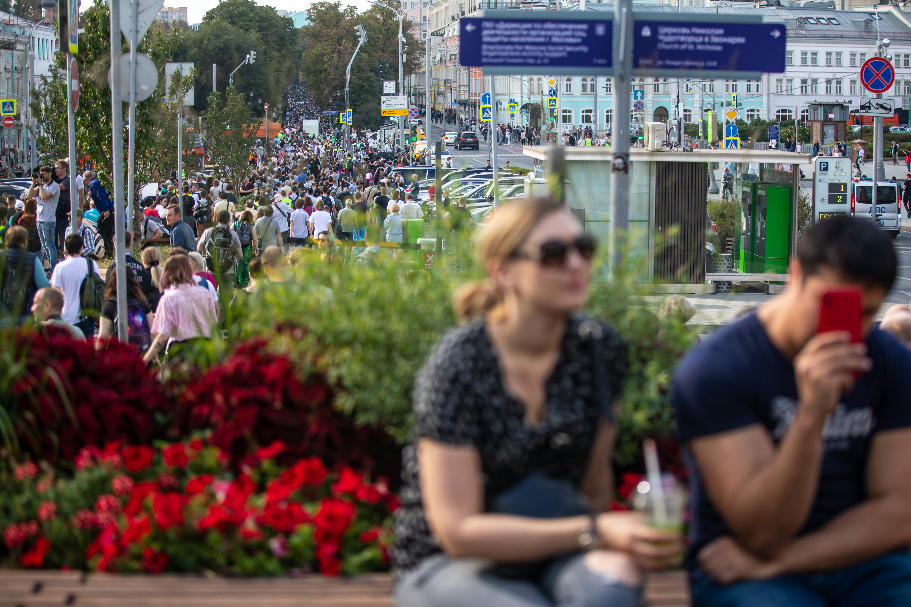 В центре Москвы прошло шествие, которое организовала продюсер «Навальный LIVE» Любовь Соболь. Марш назвали «Против политических репрессий»: оппозиционеры потребовали допуска независимых кандидатов в Мосгордуму и освобождения арестованных участников протестных акций. Хотя шествие не согласовали московские власти, полиция никого не задержала. «Медиазона» публикует фотографии Давида Френкеля, который прошелся с протестующими по московским бульварам, а потом наблюдал, как они продолжают несколько часов ходить по городу.