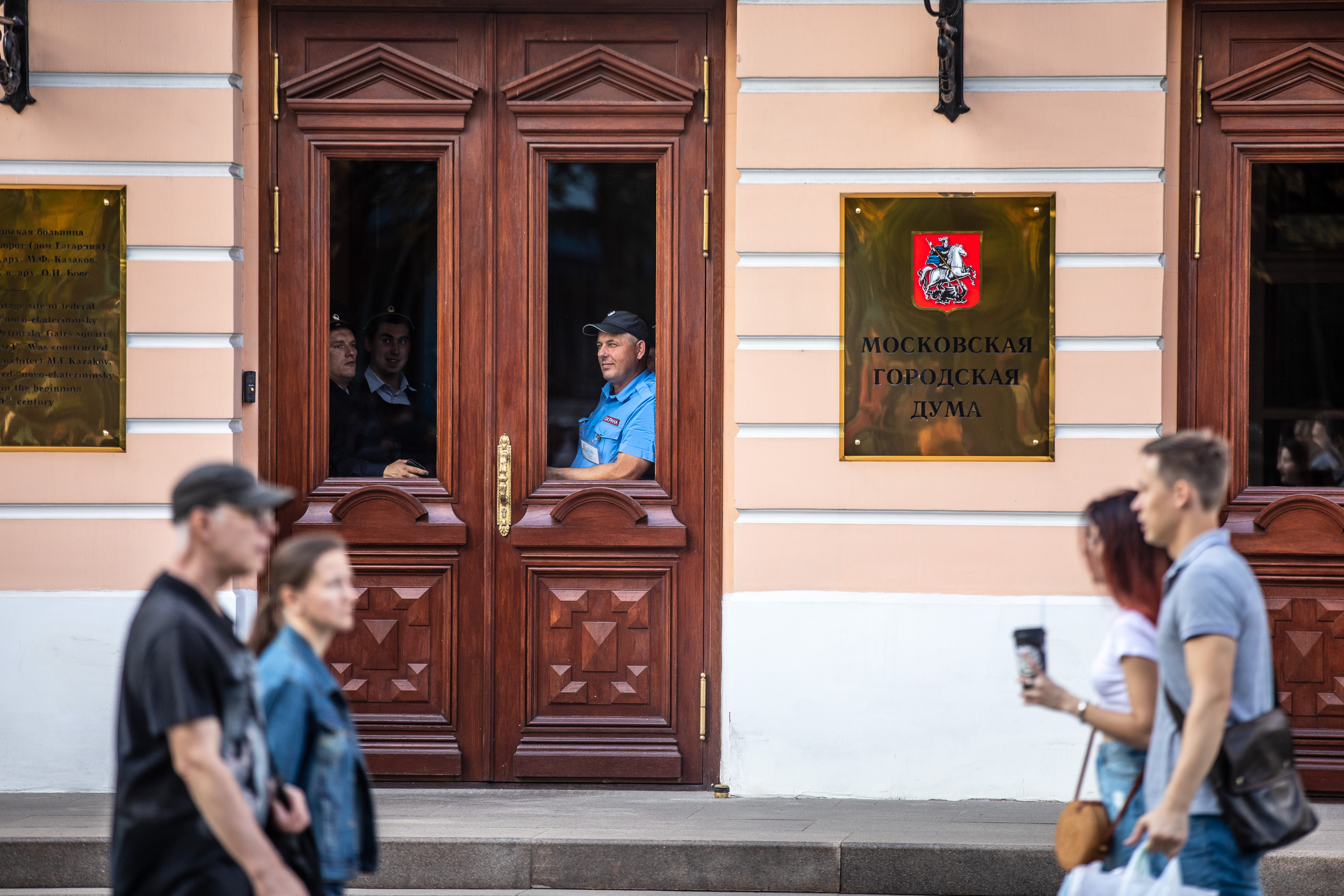 Демонстранты проходили мимо здания Мосгордумы, выборы в которую вызвали протесты.