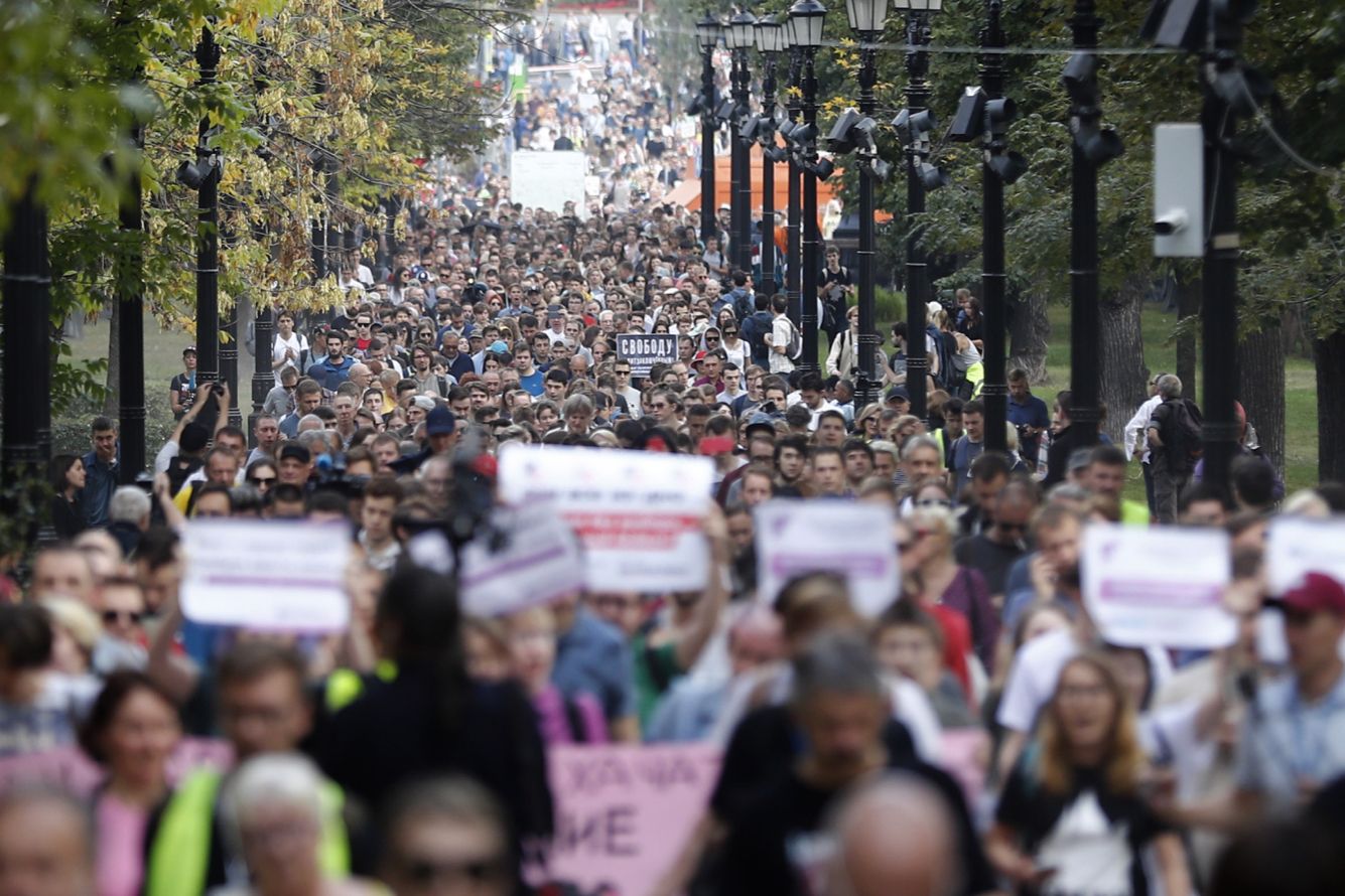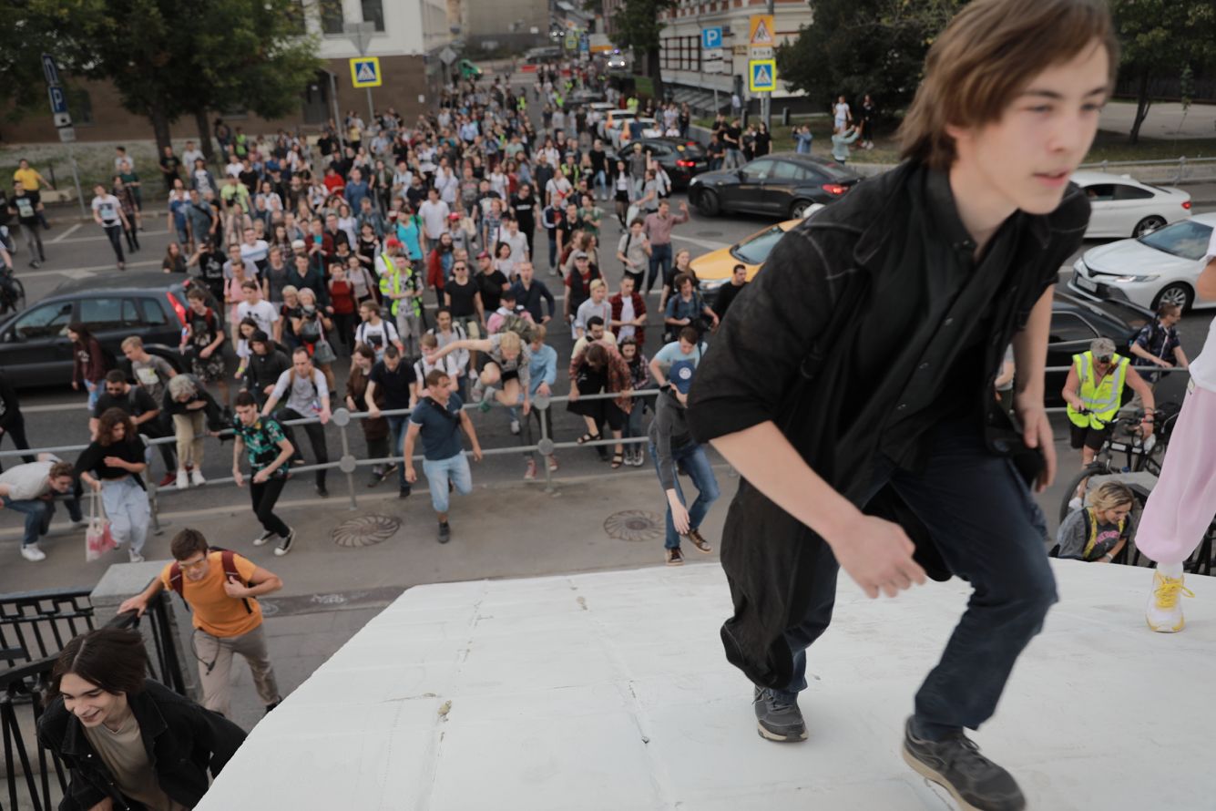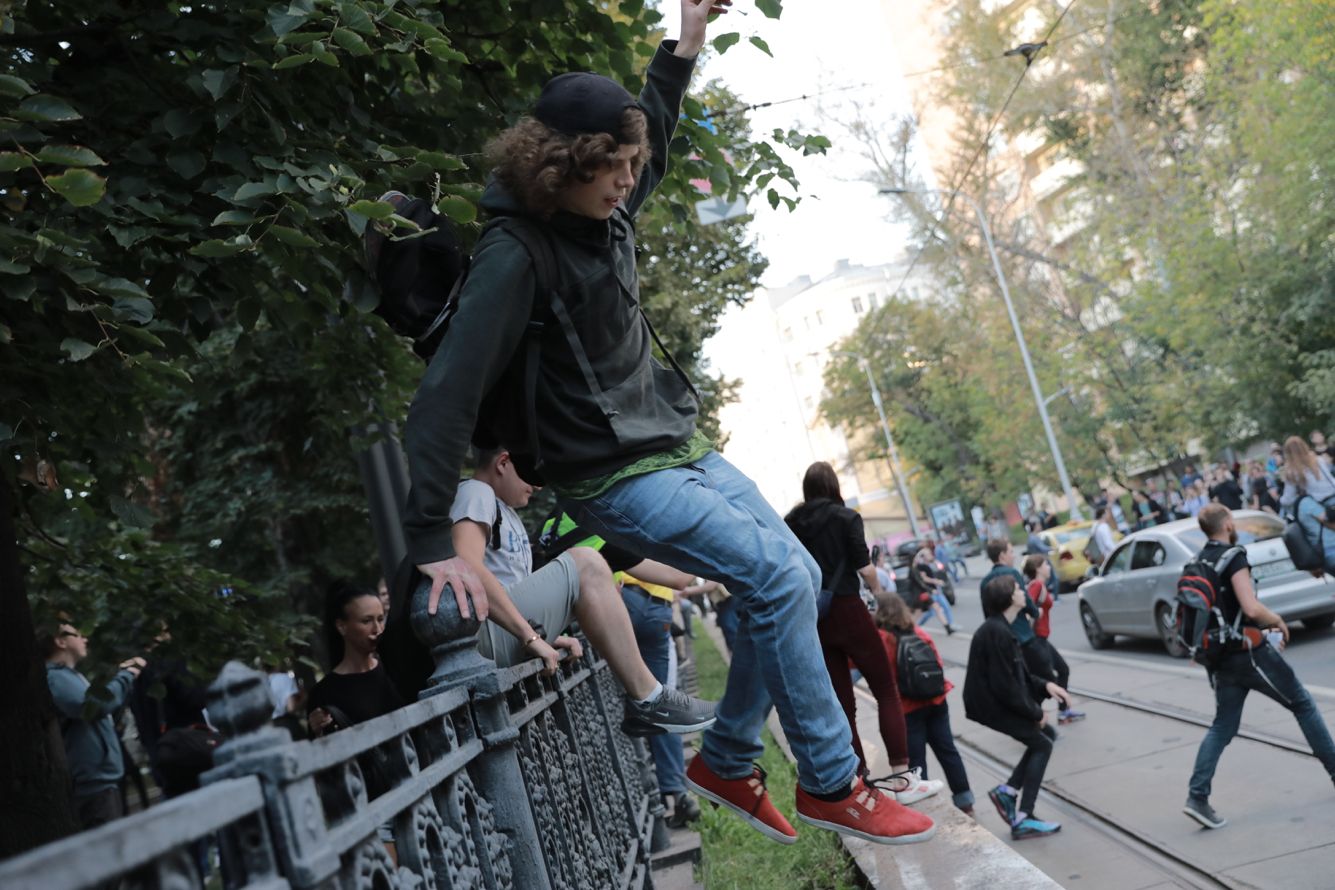 31 августа в Москве от Чистых прудов до Пушкинской площади прошло несогласованное шествие против политических репрессий. По данным ГУ МВД, в нем приняло участие 750 человек, по оценке корреспондента «Медузы» — несколько тысяч. В отличие от прошлых несогласованных акций, в эту субботу обошлось вообще без задержаний. Полицейские просто следили, чтобы протестующие не выходили на проезжую часть. Корреспонденты «Медузы» наблюдали за самым мирным протестным шествием этого лета, а также за организованным одновременно с ним концертом, где выступали Ольга Бузова и Тима Белорусских.