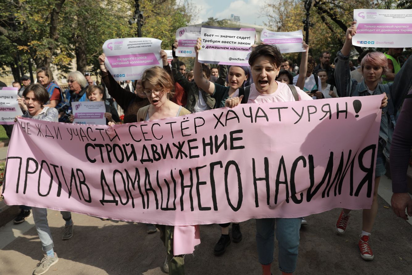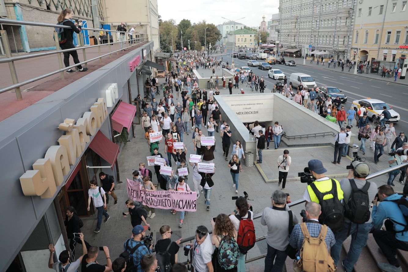 На Сретенском бульваре к шествующим присоединилась группа феминисток из организации «СоцФем Альтернатива». Два месяца они пытались добиться от московских властей согласования акции в поддержку сестер Хачатурян, но безуспешно. Теперь они возглавляют шествие, неся большой розовый транспарант с надписью: «Не жди участи сестер Хачатурян! Строй движение против домашнего насилия».