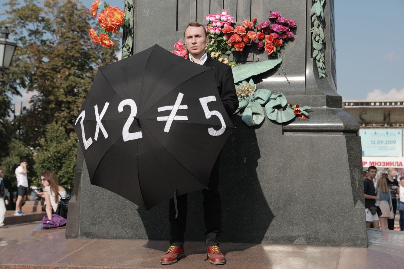 К семи вечера на площади остается еще около 50 человек. Среди них — 27-летний Филипп Кузнецов, стоящий у памятника под зонтом с надписью: «2 + 2 ≠ 5». Он объясняет корреспонденту «Медузы», что вкладывает в этот пример «борьбу за правды». «Этим летом произошли какие-то события, и народ объединился, начал выходить, — говорит Филипп. — Я горжусь каждым, кто сегодня вышел. Я безумно счастлив, что люди начали просыпаться и смелеть».