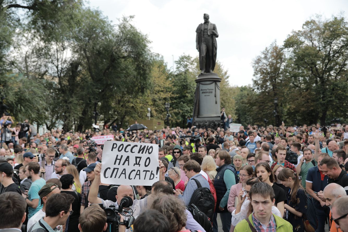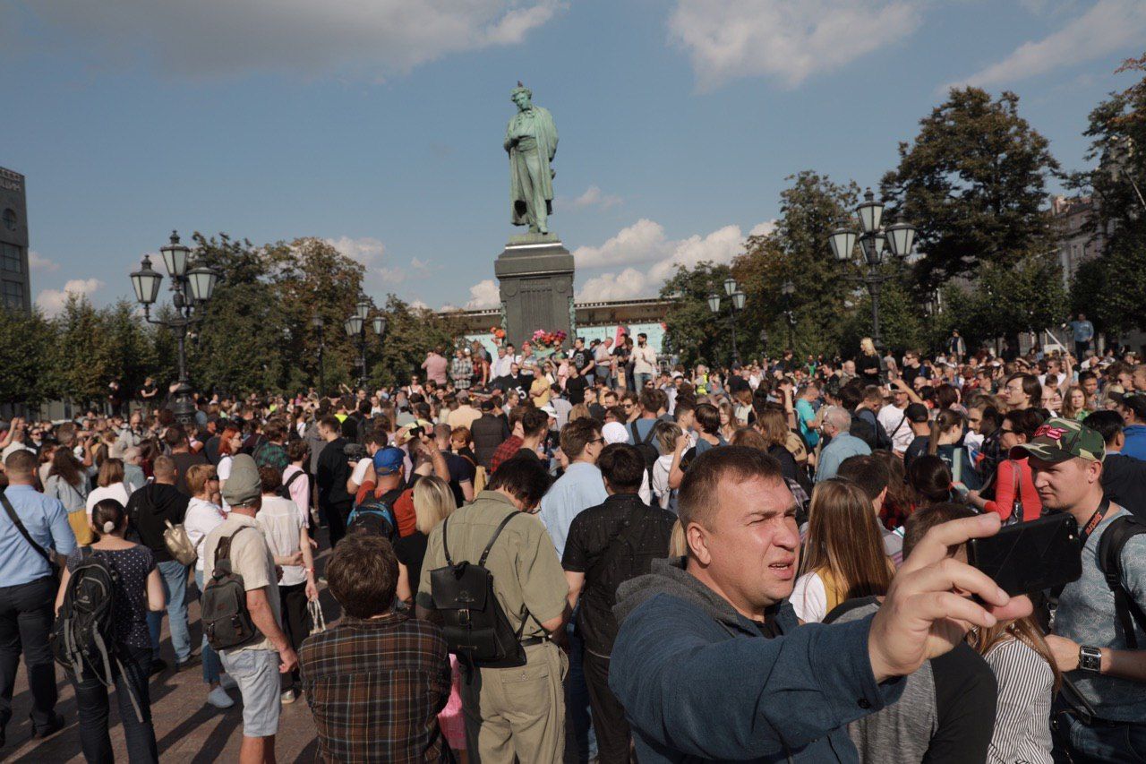Через несколько минут кто-то замечает бегущих к площади сотрудников Росгвардии и ОМОНа, а также колонну автозаков. Часть людей успевает уйти по Тверской в сторону мэрии — они пройдут Новый Арбат и дойдут до Новинского бульвара. Но большинство остается в двойном оцеплении — силовики окружают всю площадь, держась за руки. Но никого не задерживают. Через час оцепление и вовсе снимают. Один из омоновцев объяснил корреспонденту «Новой газеты» Лизе Кирпановой это тем, что у них «закончился рабочий день».