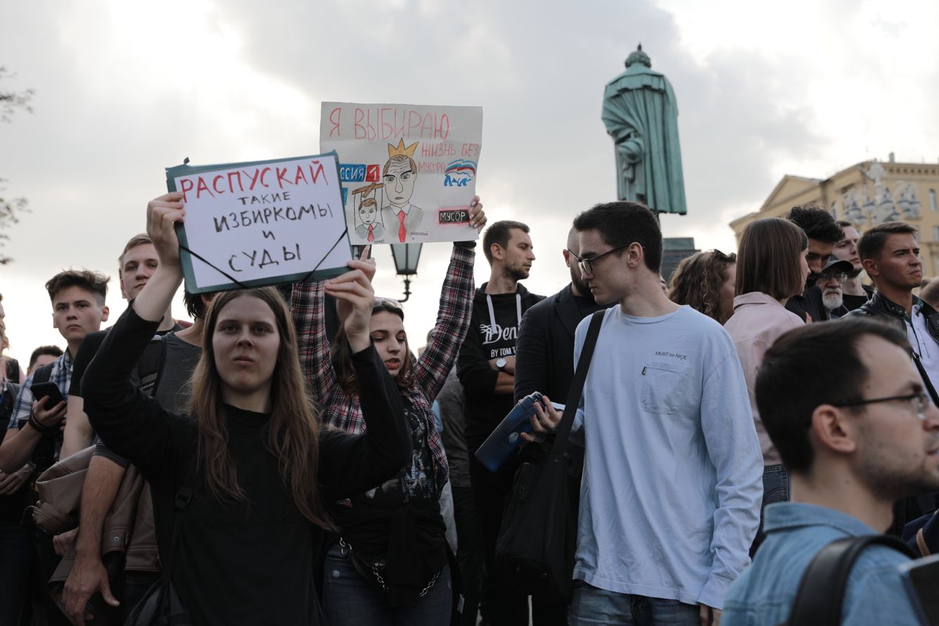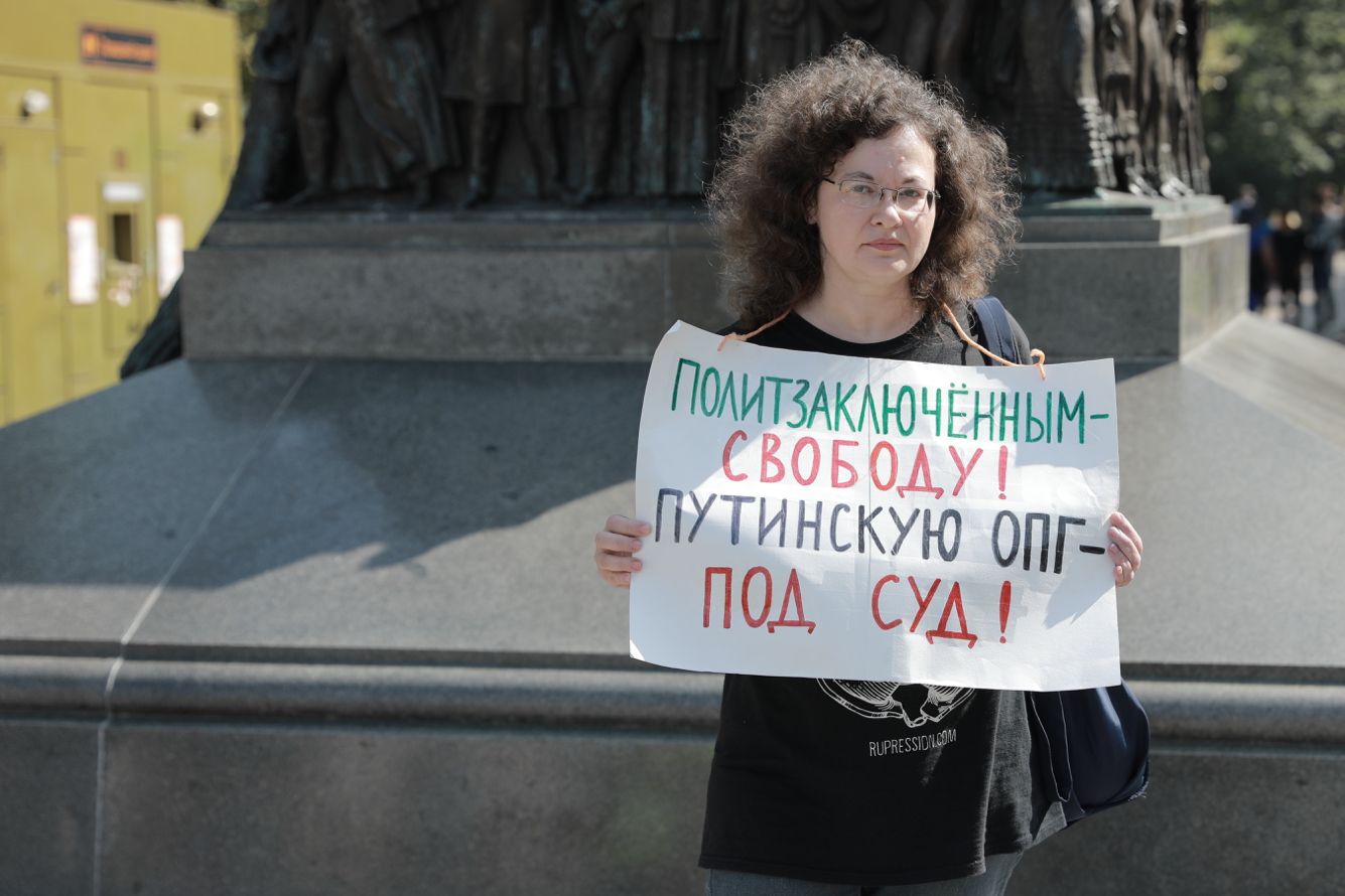 Женщина с плакатом представляется корреспонденту «Медузы» Ольгой Назаренко. Ей 44 года, она работает преподавателем в одном из вузов города Иваново, а потому, по ее словам, на акциях бывает не часто. «[Мне не все равно, потому что] выборы в Мосгордуму в миниатюре отражают ситуацию с „выборами“ по всей стране. Везде у нас не допускают тех, кто опасен для власти. Везде у нас фальсификации, — говорит Ольга. — Людям, которые ставили подписи, плюнули в лицо, сказали, что их мнение никого не интересует. Для меня это — как будто мне в лицо плюнули. Тут уже больше не про выборы, а про чувство собственного достоинства. Невозможно молча вытираться, когда постоянно плюют в лицо». Назаренко добавляет, что еще одной причиной присоединиться к протесту стали уголовные дела против участников мирных акций.