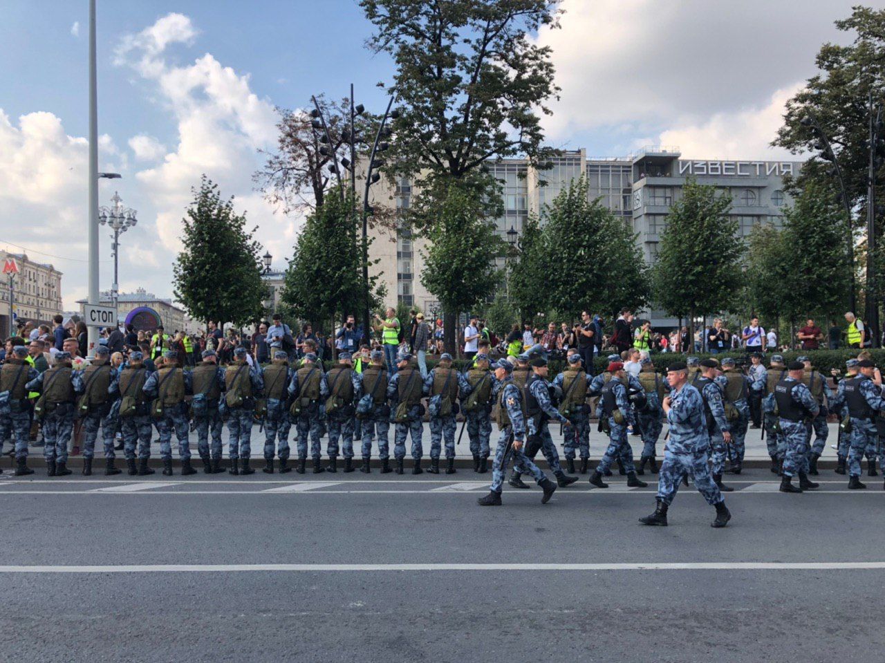 Цепочка ОМОН выстраивается по Страстному бульвару — от Тверской до кинотеатра «Россия».