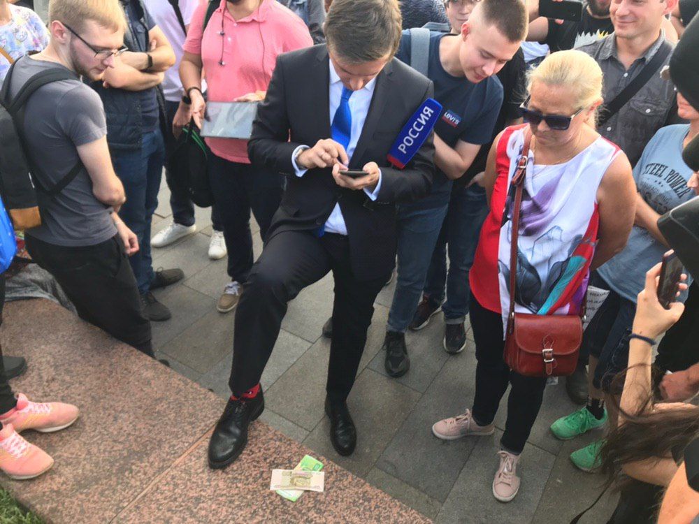 Корреспонденту ВГТРК Ярославу Красиенко мешают работать, бросая деньги под ноги.