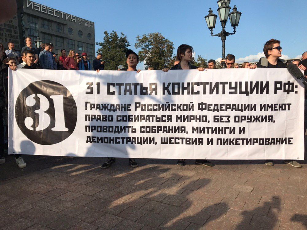 На Пушкинской площади развернули транспарант с полным текстом 31-й статьи Конституции, посвященной свободе собраний.