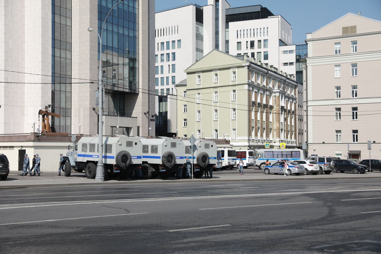Вокруг Пушкинской площади больше десятка полицейских автобусов и автозаков.