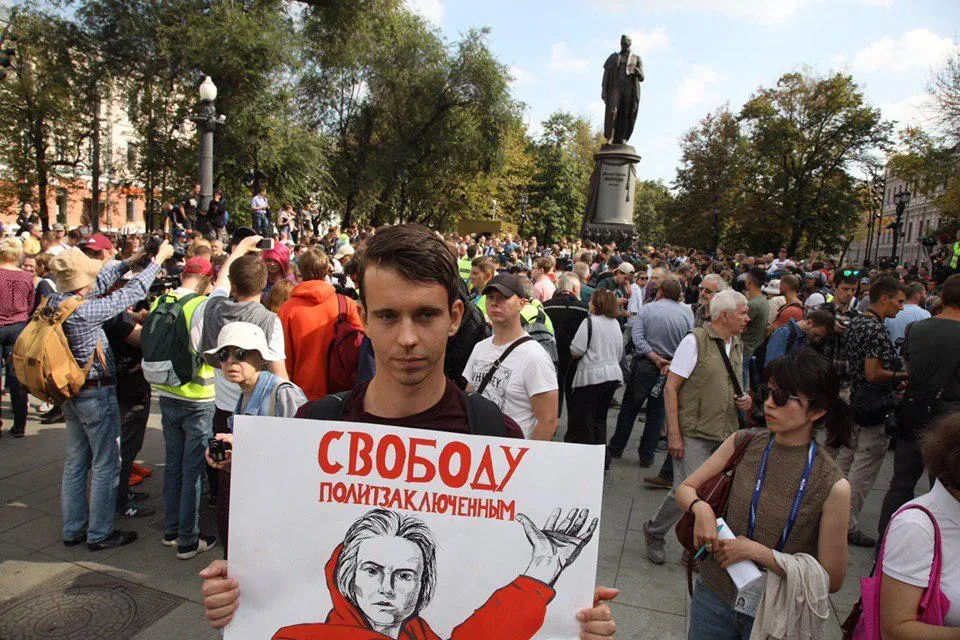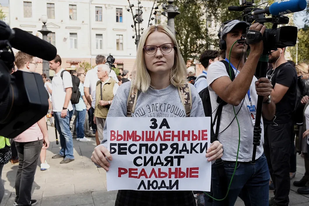 Один из первых плакатов — «За вымышленные беспорядки сидят реальные люди». Шествие 31 августа заявлено как акция против политических репрессий — повестка выборов в Мосгордуму отошла на второй план на фоне процесса о «массовых беспорядках».
