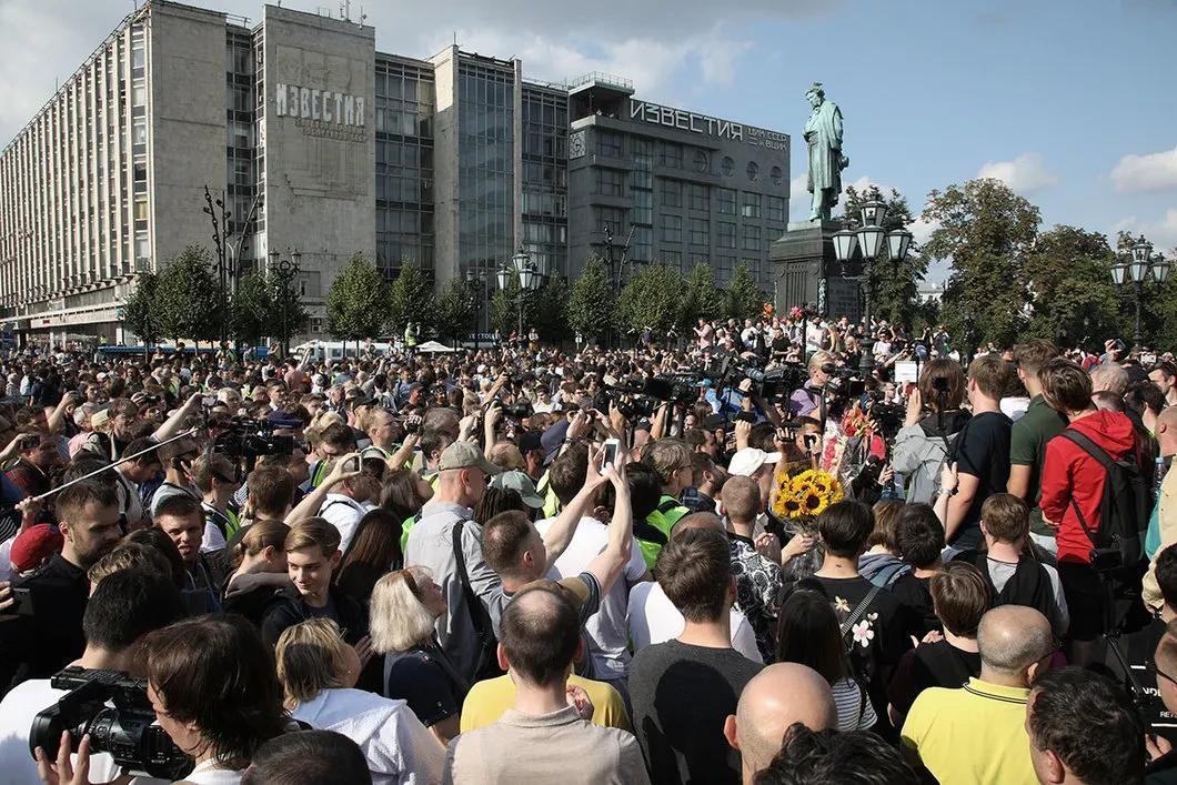 Уже к трем дня протестующие дошли до Пушкинской площади, где состоялась первая акция из серии московских протестов вокруг выборов в Мосгордуму, которая прошла 14 июля.