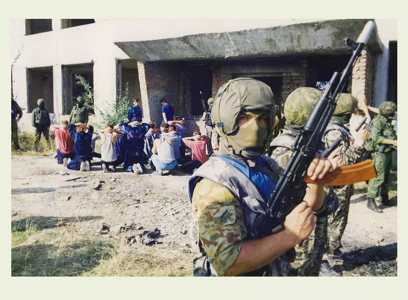 Контртеррористическая операция. Служащие внутренних войск МВД, в масках, с автоматами стоят по периметру около здания. 1999 год