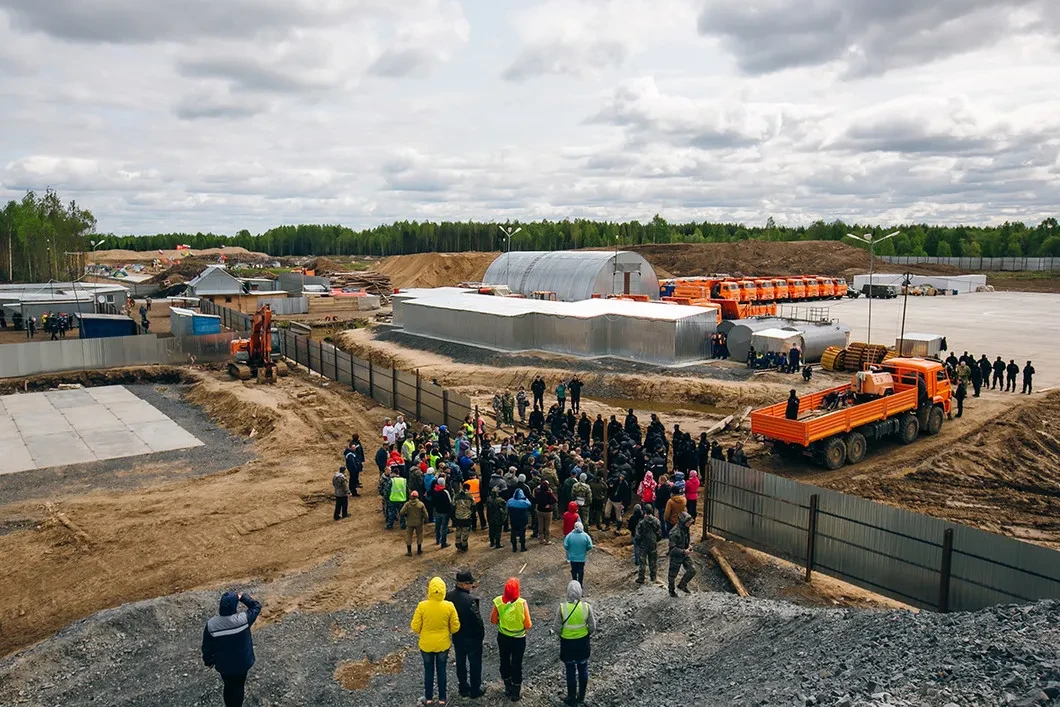 Строительство мусорного полигона на станции Шиес. На заднем плане слева — лагерь экоактивистов. Фото: Анна Шулятьева, специально для «Новой»