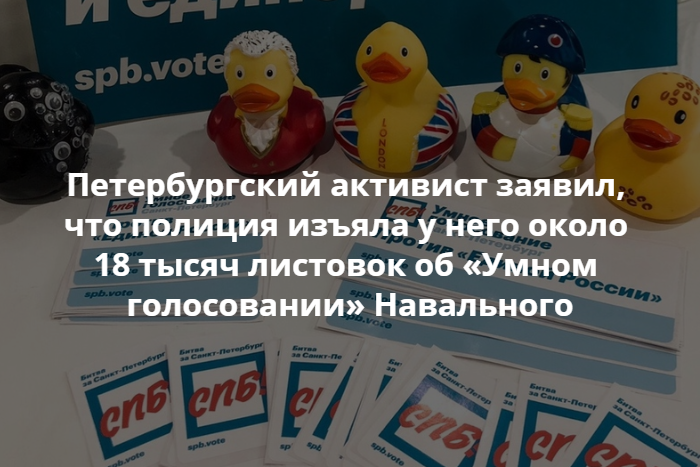 Петербургский активист Александр Шумилов заявил, что полиция изъяла у него около 18 тысяч листовок об «Умном голосовании» Алексея Навального, в которых говорится о предстоящих губернаторских и муниципальных выборах. Об этом он рассказал «Новой газете».