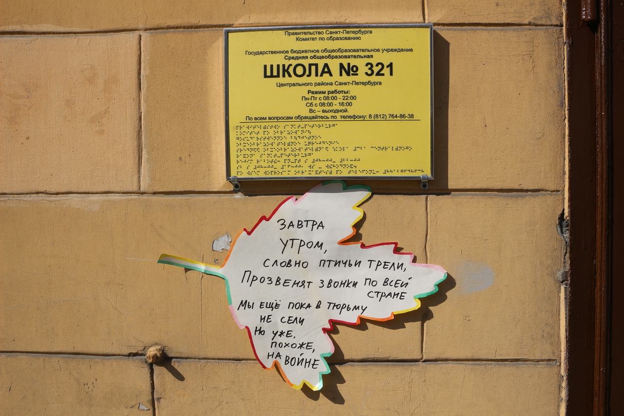 Активисты рассказали, что вывесили стихи в воскресенье, 1 сентября. Линейки в школах Петербурга и других городах России проходят 2 сентября.