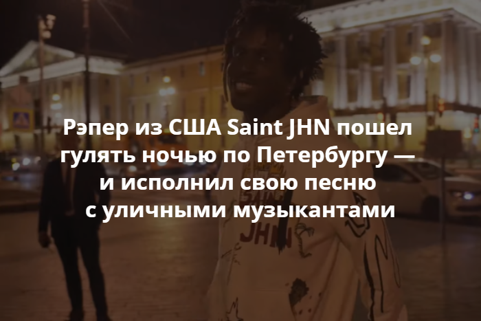 На ютьюб-канале гайано-американского рэпера Карлоса Сент-Джона (выступает под псевдонимом Saint JHN) вышло видео, на котором он исполняет свой трек «I Can Fvcking Tell» с уличными музыкантами на Дворцовой набережной в Петербурге. Внимание на это обратила «Афиша Daily».