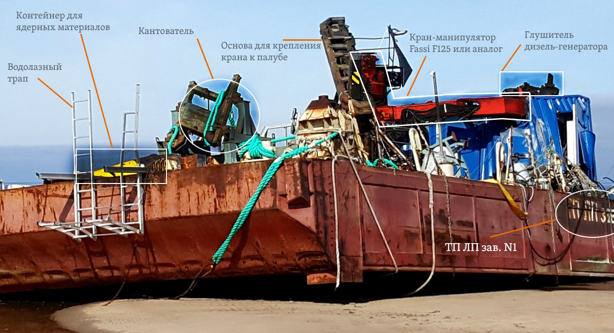 Оборудование, которое Радио Свобода удалось разглядеть на снимках понтонов, аналогично тому, которое используется для демонтажа и консервации отработавшего топлива атомных реакторов, кроме того, кран мог использоваться не только для манипуляций с реактором, но и для подъема аварийной ракеты со дна Двинского залива. На факт подводных работ дополнительно указывают имеющиеся на одном из понтонов трапы, предположительно, для водолаза (или водолазов).