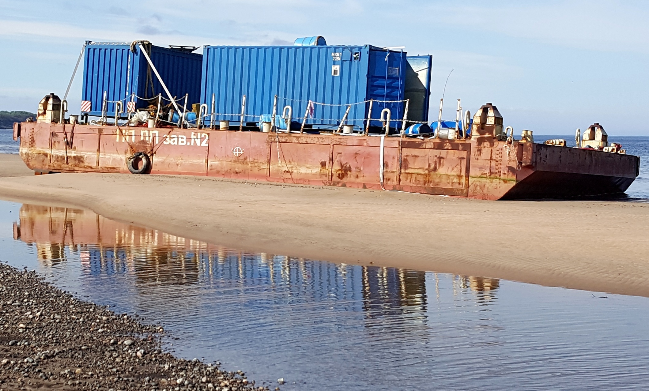 In the image from Severodvinsk there are two pontoons, one with a ramp for the entry of equipment from the shore. The second without a ramp. Then these pontoons tranferred to Nenoksa. Pontoons loading capacity 100t., length 18.72m., width 9.5m., depth 1.60m. pic.twitter.com/dWT57ZuepN