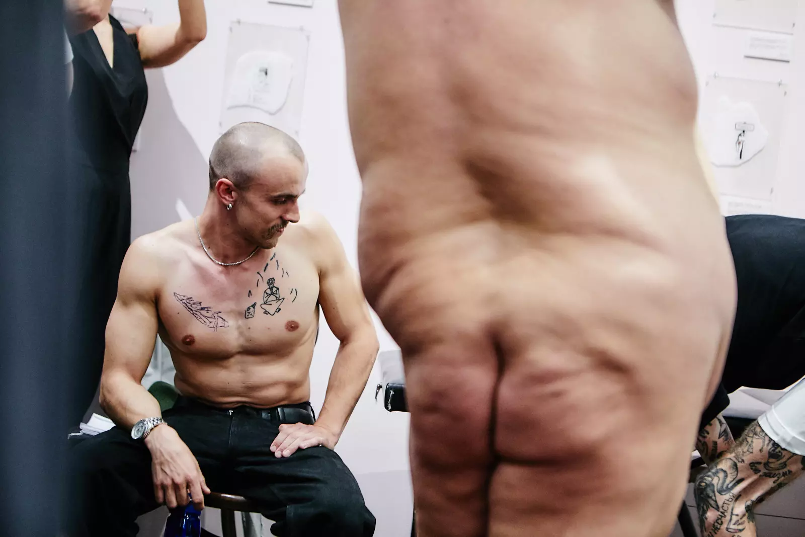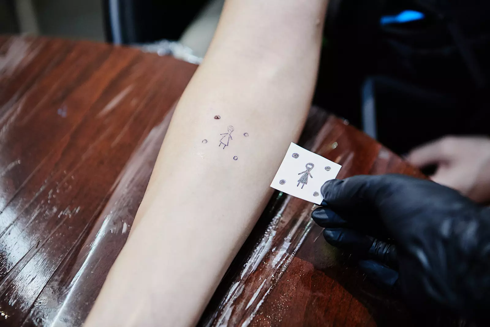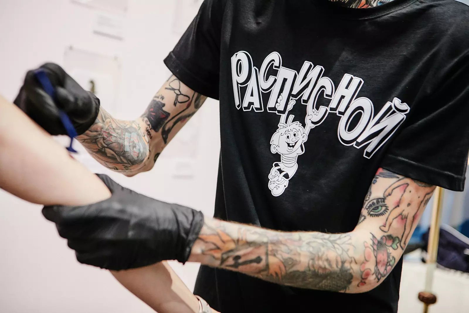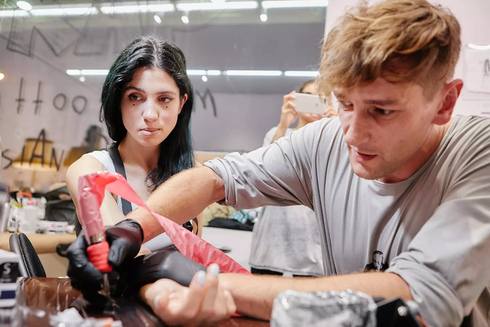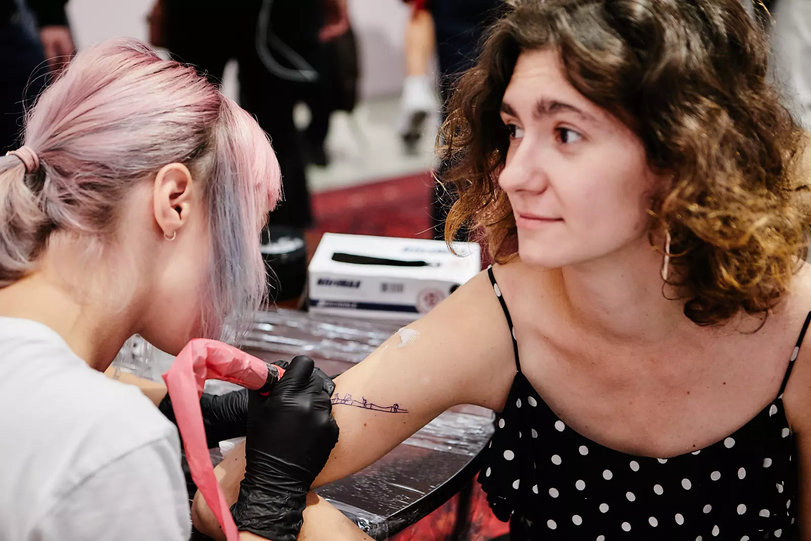 В зале жужжат тату-машинки, мастера бьют записавшимся в очередь татуировки по эскизам Олега. На нанесение татуировки выделяют по часу на каждого. Лиза была первой, татуировщица Маша набила ей «Восхождение» на предплечье.