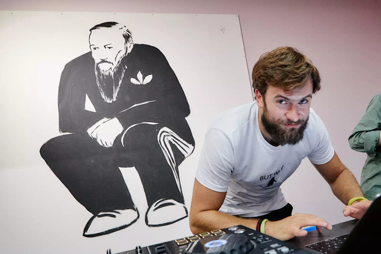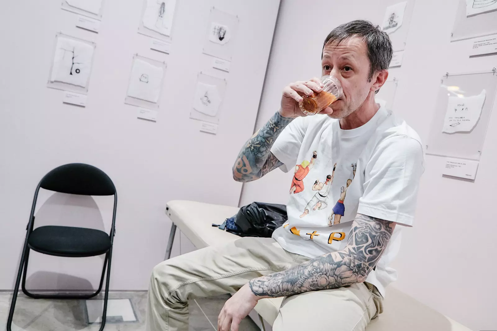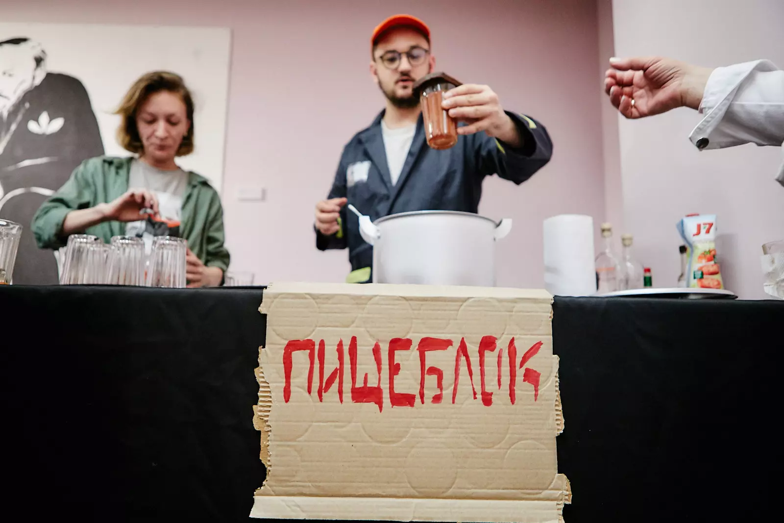 В дальнем зале играет диджей-сет Петр Верзилов. За ним рисунок — Достоевский на кортах и в адидасе, справа «пищеблок» — парень в комбинезоне «ШИЗО» разливает «Кровавую Мэри» из кастрюли под «Не надо стесняться». Сюда выстроилась очередь. А вдоль нее полотно почти на всю стену с контурами России, увешанное кипятильниками. В углу общаются сотрудники ФБК Руслан Шаведдинов (у нас с ним вышел подкаст о молодых политиках) и Николай Ляскин, которого за день до этого задержали для составления протокола о нарушении правил проведения митингов (часть 5 статьи 20.2 КоАП) из-за шествия 31 августа. Позже на выставку пришли Шило из «Кровостока», Настя Креслина из группы «IC3PEAK» и Алексей Навальный с женой Юлией.