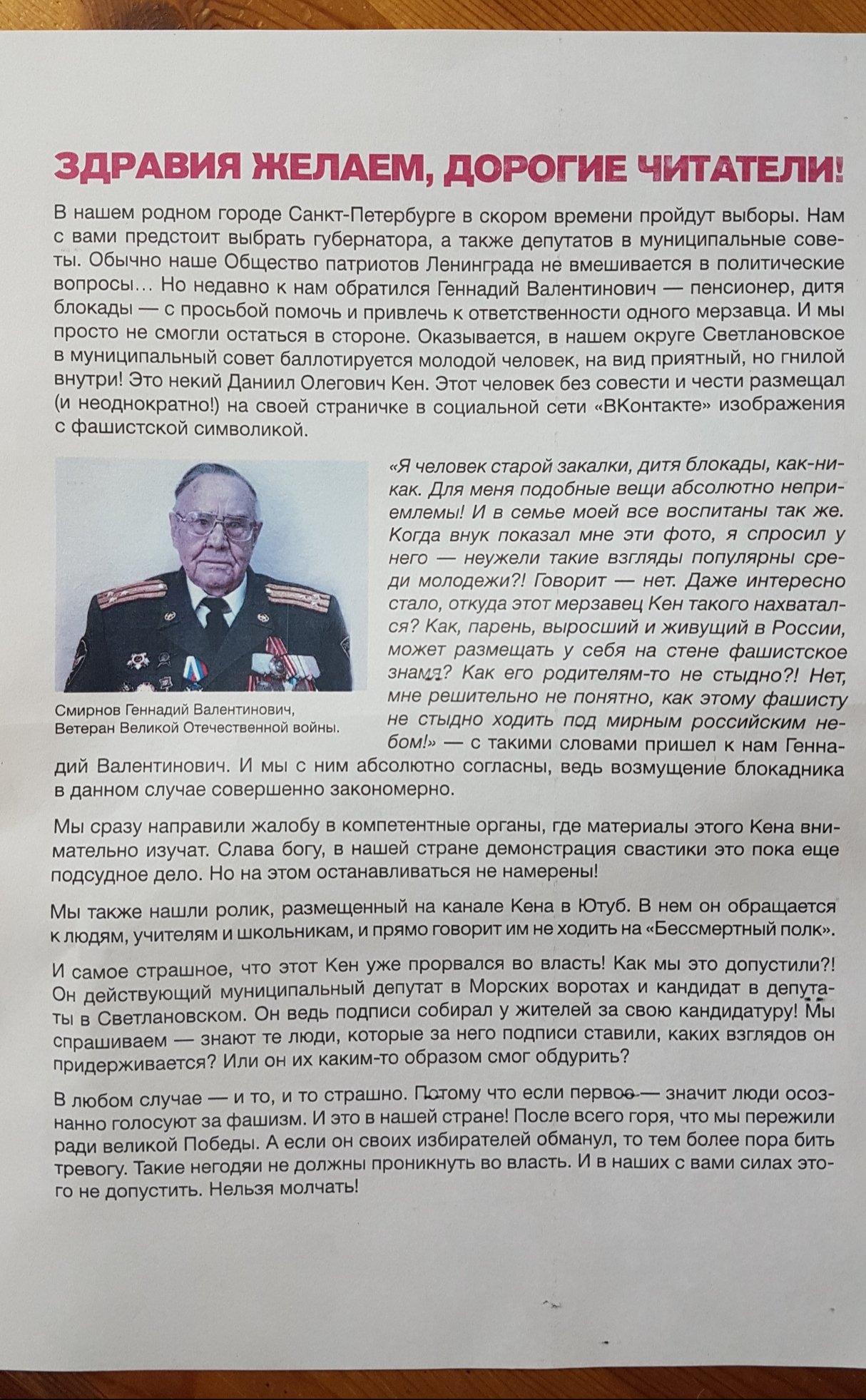 В конце августа кандидат в муниципальные депутаты Даниил Кен рассказал, что в округе «Светлановское» распространяют листовки, в которых его обвиняют в поддержке фашизма.