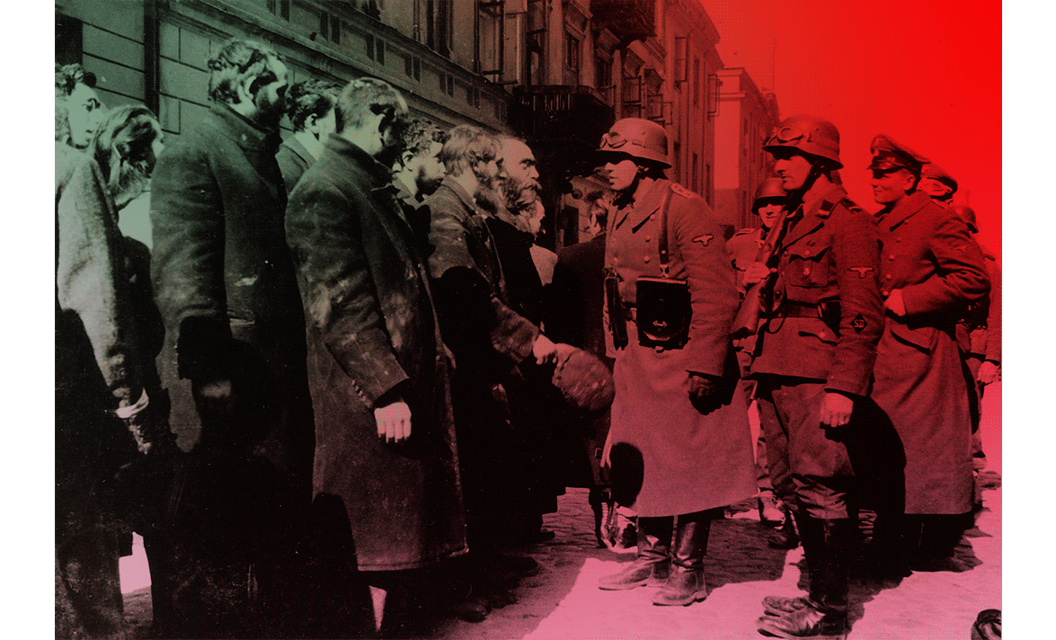 Сержант СС допрашивает евреев, захваченных во время подавления восстания в Варшавском гетто