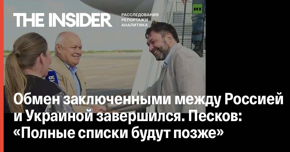 Песков подтвердил, что в Россию, в частности вернулся главный редактор РИА «Новости Украина» Кирилл Вышинский, других участников обмена он называть не стал. «Там Вышинский есть. Списки последуют позже. Пока в целом оценка такая», — заявил Песков.
