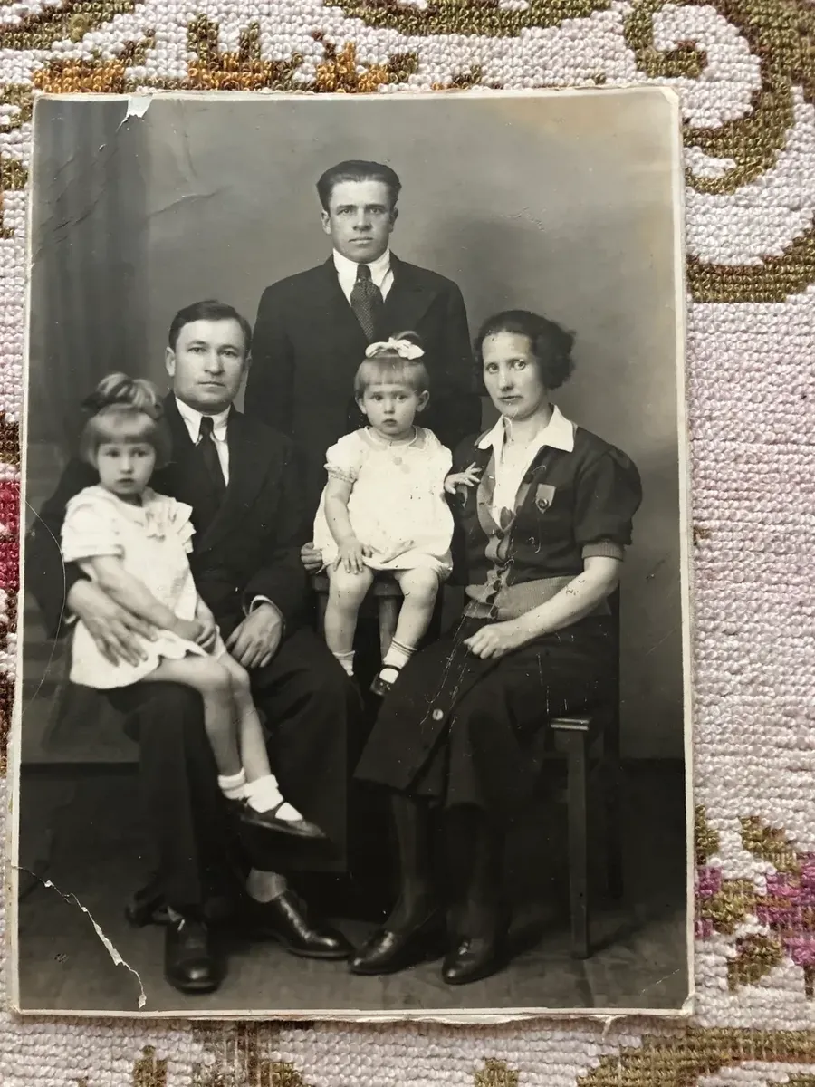 Слева направо в первом ряду: Надежда Александровна (на руках у отца), отец Александр Иванович, младшая сестра Вера, мать Прасковья Георгиевна.На заднем плане: брат отца, Аркадий. 1939 г. Фото из архива