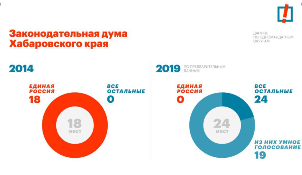- Самым неожиданным оказался промежуточный результат выборов депутатов заксобрания Хабаровского края. Там с большим отрывом лидирует ЛДПР. К 21:00 по московскому времени она набрала 55,8% голосов, «Единая Россия» на третьем месте с результатом 13,4% голосов. Кандидаты от ЛДПР — участники местного «умного голосования». Если распределение голосов сохранится, это будет значить, что победителями стали 80% из предложенных командой Навального кандидатов.