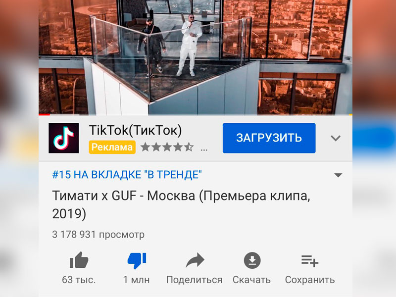 Миллион дизлайков клипа Тимати и Гуфа Клип рэперов Тимати и Гуфа на песню «Москва» побил рекорд российского сегмента видеосервиса по числу недовольных откликов. Оба артиста отреклись от обвинений в проплаченности песни и видео. Смотрите также: Топ новостей 9 сентября