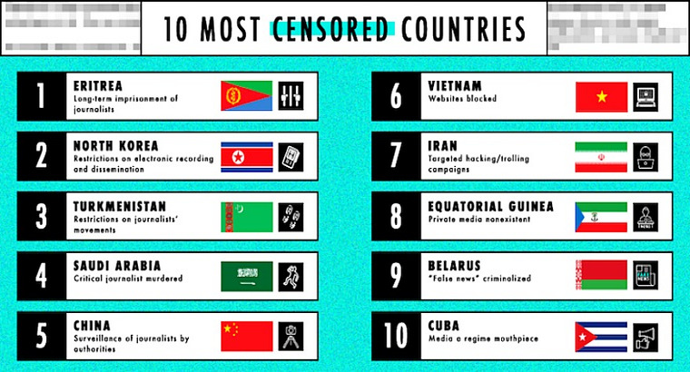 Согласно статьи 19 Всеобщей Декларации Прав Человека, каждый имеет право на поиск и получения новостей, а также высказывание собственного мнения. Но данные десять стран расположились в той части мира, где считаются в порядке вещей запугивание, а также цифровая и физическая слежка. Распространены и другие формы преследования, а самоцензура считается явлением масштабным.
