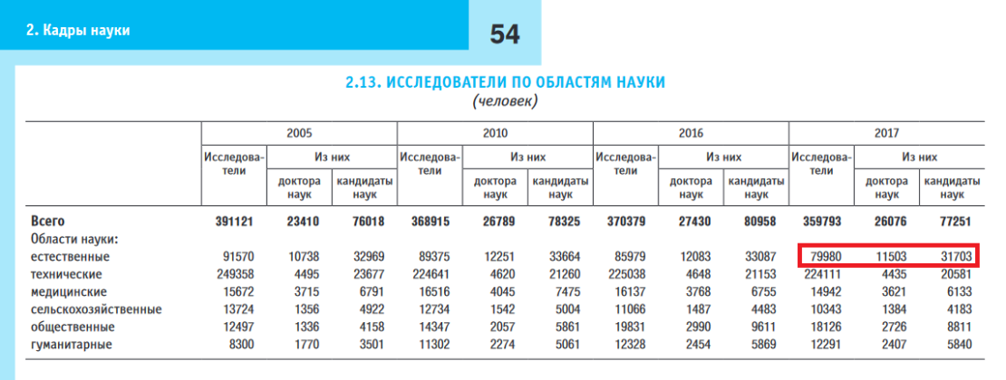 В ходе краудфандинга по мотивам присходивших обсуждений мы изучили новый для КЭ вопрос о госстатистике. Из источника [4] удалось узнать, что в 2017 году в области естественных наук работало около 80 тыс. человек, из них с ученой степенью — примерно 43 тыс. человек (см. таблицу ниже). Эти цифры полезно иметь в виду при обсуждении вопроса о том, насколько база КЭ репрезентативна и каковы перспективы ее расширения.