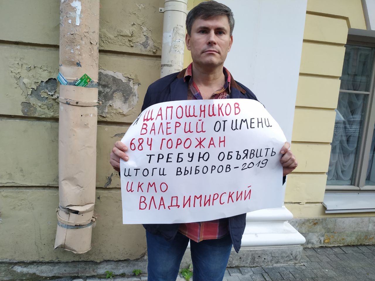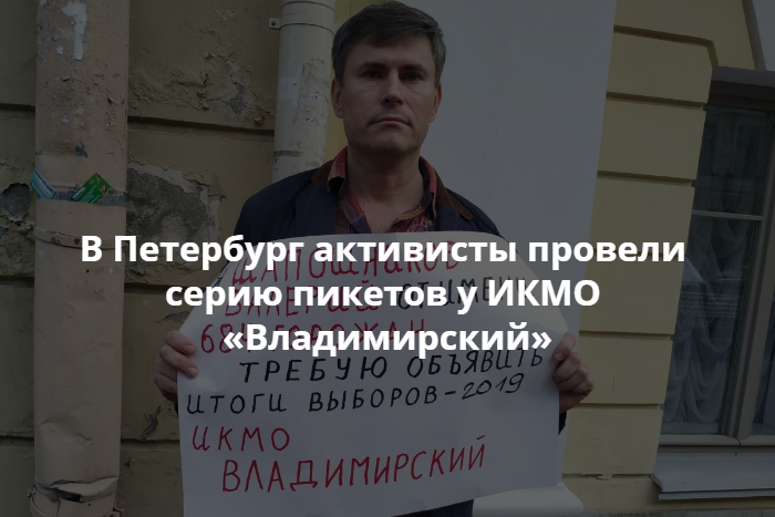 В Петербурге у ИКМО «Владимирский» прошла серия одиночных пикетов с требованием объявить итоги муниципальных выборов.