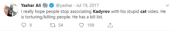 "Я очень надеюсь, что люди перестанут ассоциировать Кадырова с этим глупым видео про кошку. Он пытает/убивает людей. У него есть список убитых", – отмечает в Twitter пользователь Йашар Али.