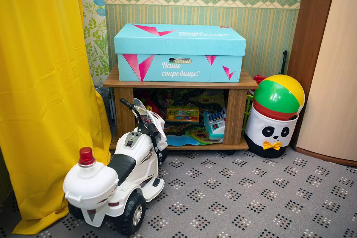 В зале обычно спит Буся, здесь много игрушек, на столе лежит большая коробка с надписью «Наша гордость» — от Собянина, для Алисы, объясняет Диана.