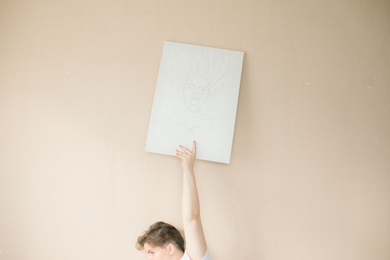 Наталья держит свою начатую картину «Отречение»: «Через два месяца после родов я пришла в православный храм, хотела поставить свечку за упокой и помолиться в церкви. Спросила совета у батюшки, к какой иконе лучше подойти, а батюшка ответил, что моя дочка некрещеная грешница и я не могу молиться за нее в храме, только дома. Молитв за некрещеных младенцев нет. И мне нужно просить бога о прощении и очищении ее души. После этих слов у меня ушла вся земля из-под ног. Уходя из церкви в слезах, я срывала с шеи крестик. Больше в церкви я не была ни разу после потери.»Фото: Ксения Иванова для ТД «Меня повезли на УЗИ, и я впервые увидела своего сына. Сначала медики замерили параметры тела: ручки, головка, все в порядке. Слушают сердцебиение — тишина. Я лежу на кушетке, чувствую холод геля на животе, смотрю на монитор. А врачи выносят вердикт: “Ничего хорошего не скажем. Сердце остановилось. Ваш ребенок умер”».