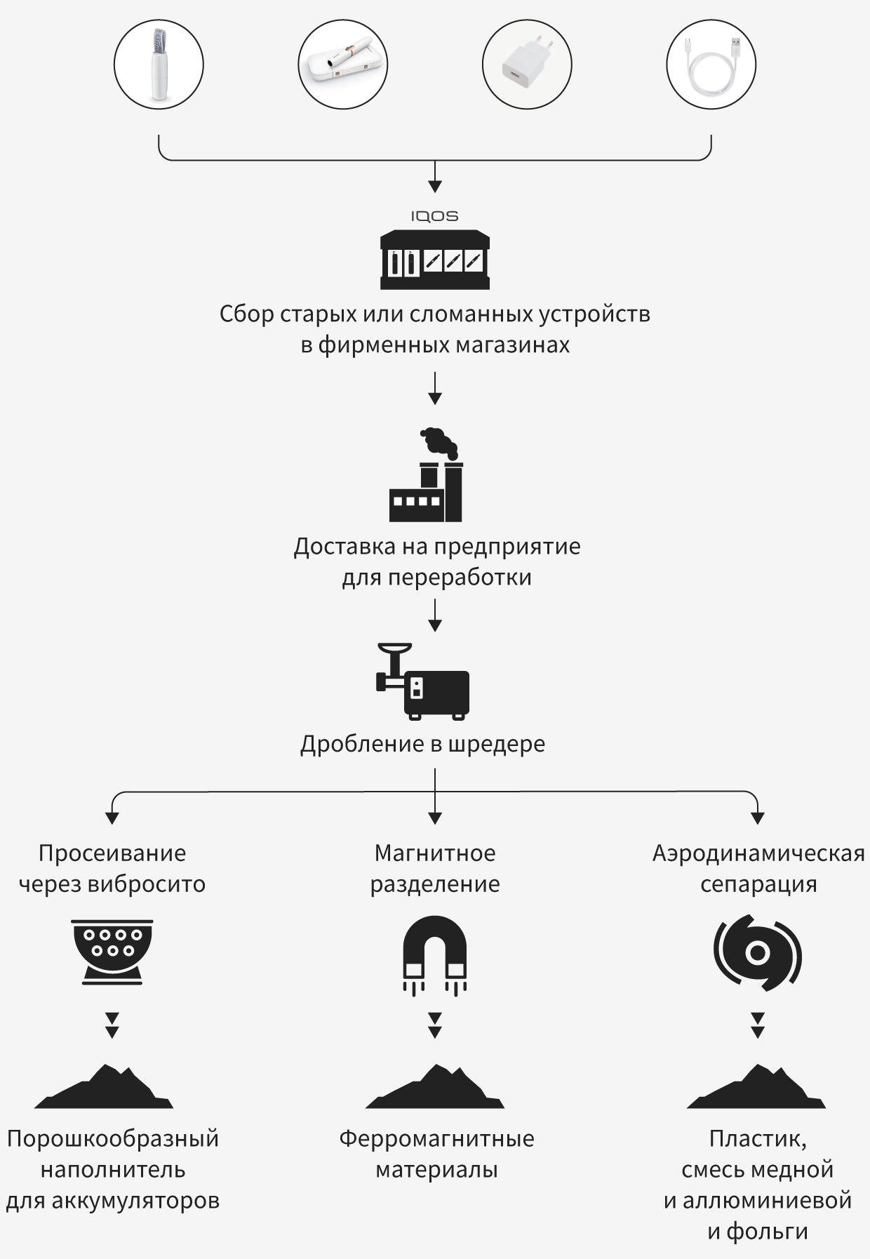 Таким же принципам следует бренд IQOS: для своих клиентов он запустил сервис по сбору и переработке старых и сломанных устройств. В фирменных магазинах бренда на переработку принимаются зарядные устройства, держатели систем нагревания табака, а также блоки питания, кабели, чистящие устройства и аксессуары для IQOS. За сдачу держателей и зарядных устройств клиенту начисляют баллы в программе лояльности IQOS CLUB. У бренда есть предприятие-партнер, которое занимается технической утилизацией старых и сломанных устройств IQOS: сначала их измельчают в специальном оборудовании, а полученную массу затем разделяют по видам материалов. Для этого используют автоматизированные решения: вибросито, магнитное разделение и аэродинамическую сепарацию. В результате из девайсов получают такое сырье, как ферромагнитные материалы, порошкообразный наполнитель для аккумуляторов, пластик, медь и алюминий.