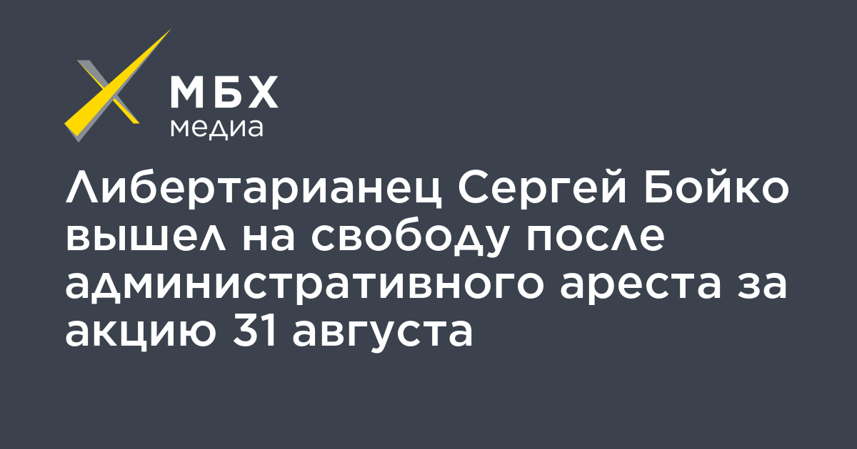 Председатель федерального комитета Либертарианской партии России (ЛПР) Сергей Бойко вышел из спецприемника после административного ареста за акцию 31 августа, об этом сообщает корреспондент «МБХ медиа».