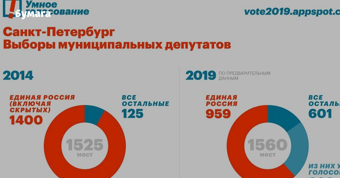 Штаб Навального в Петербурге опубликовал инфографику, на которой сравнил итоги муниципальных выборов 2014 года и предварительные результаты муниципальных выборов 2019 года. В частности, они сопоставили соотношение избранных депутатов от «Единой России» и остальных в обоих кампаниях.