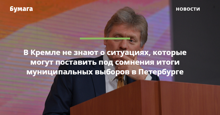 «Нам неизвестно о том, что имеют место какие-то ситуации, которые могут хоть как-то поставить под сомнение выборы, которые состоялись в Питере <…> Что касается каких-то возможных шероховатостей, то этим занимается ЦИК, причем занимается достаточно активно», — цитирует агентство Пескова.