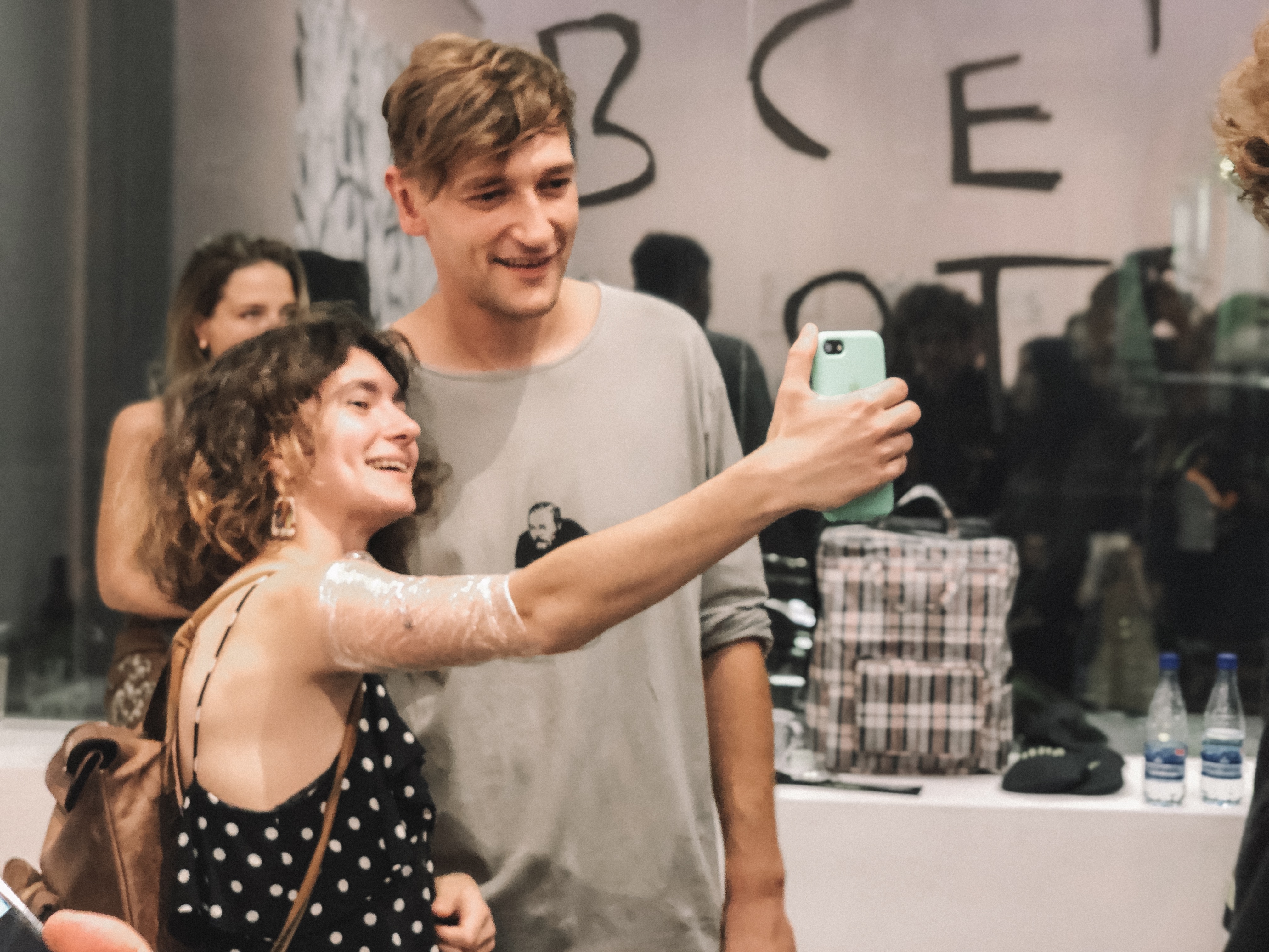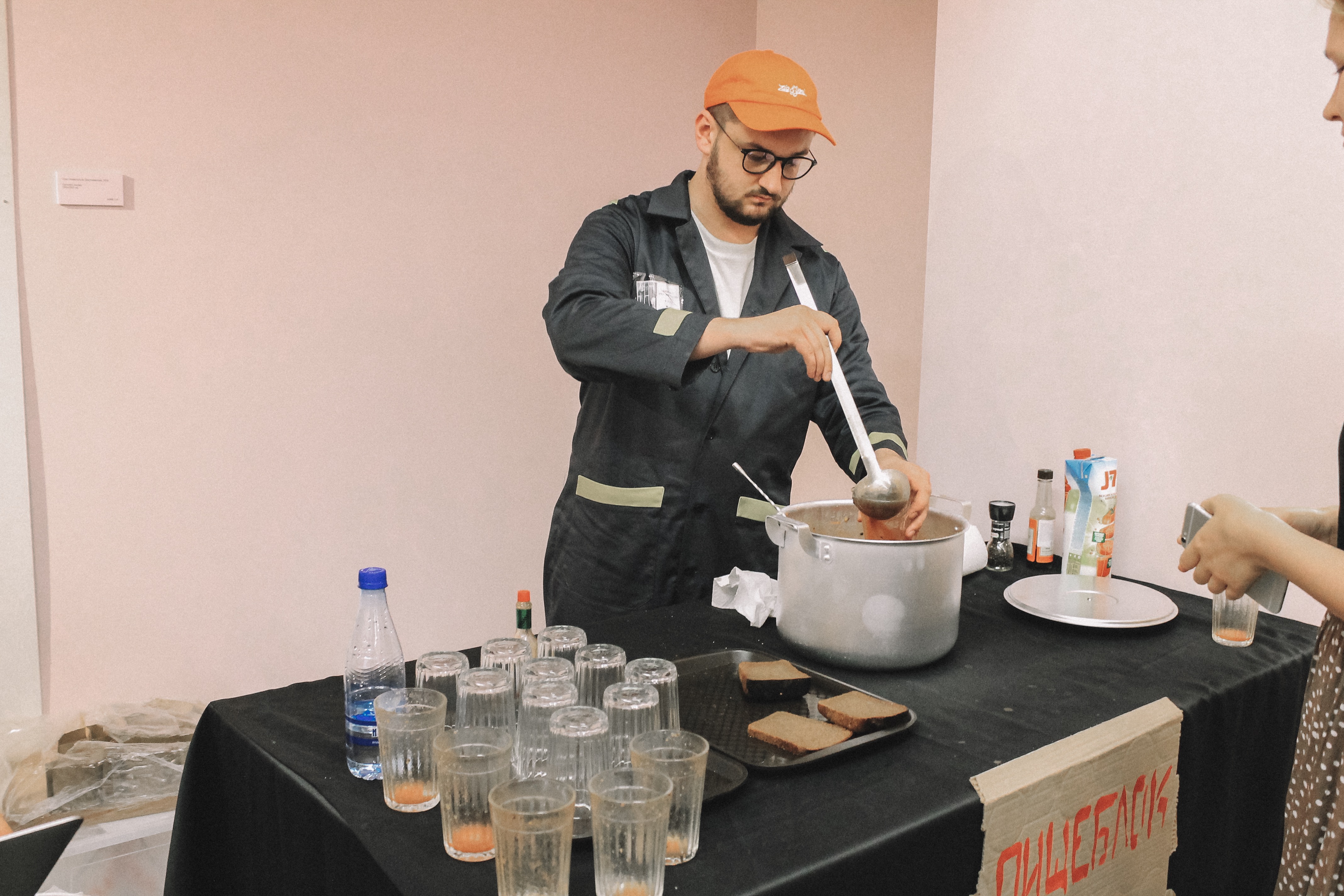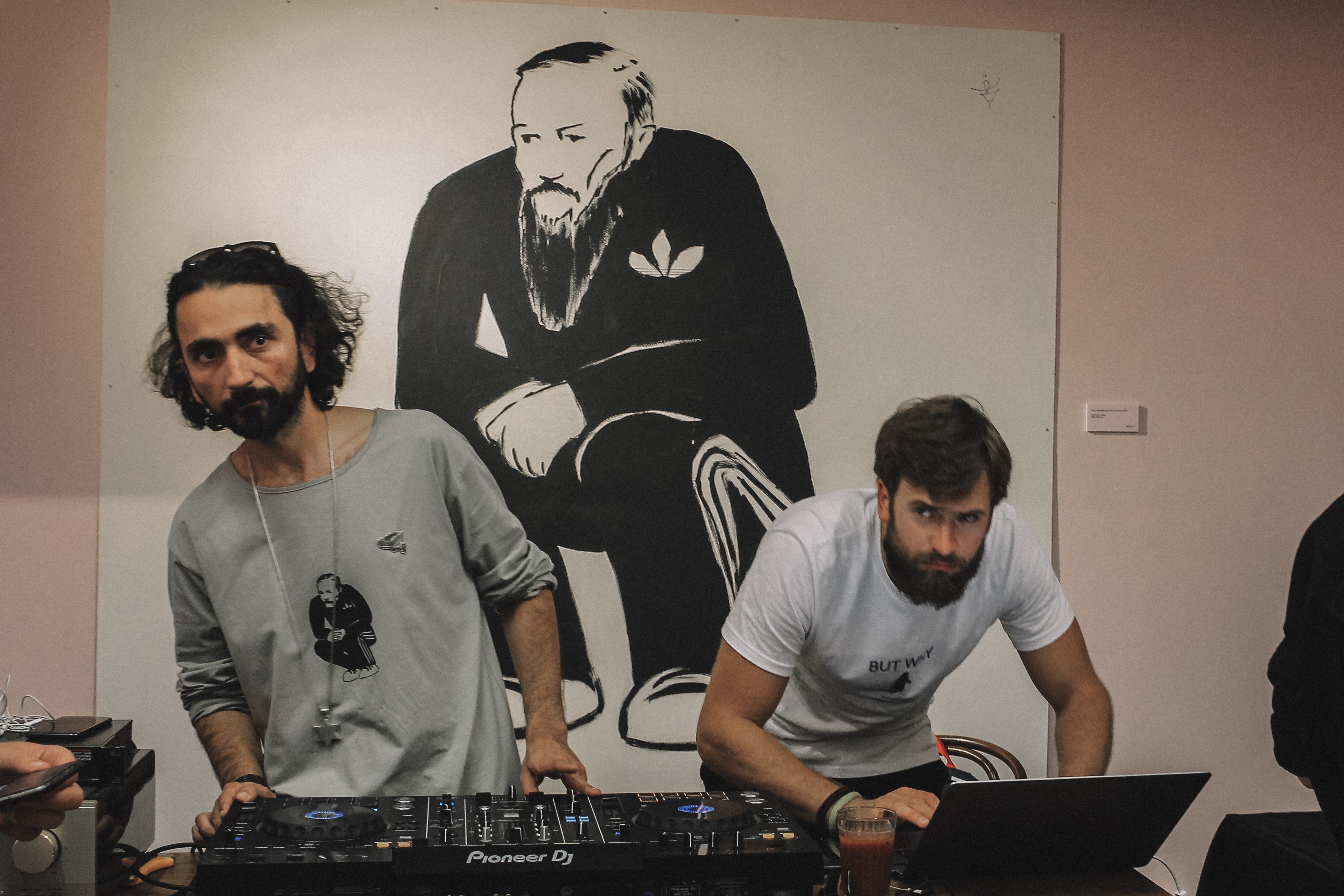 На выставку пришло много людей, они стараются протиснуться в дальний зал, где у диджейского пульта издатель "Медиазоны" Петр Верзилов и музыкальный и театральный продюсер, основатель московской "Хип-хоп академии" Михаил Огер ставят новые треки. Позже к ним присоединяется участница панк-группы Pussy Riot Надежда Толоконникова.