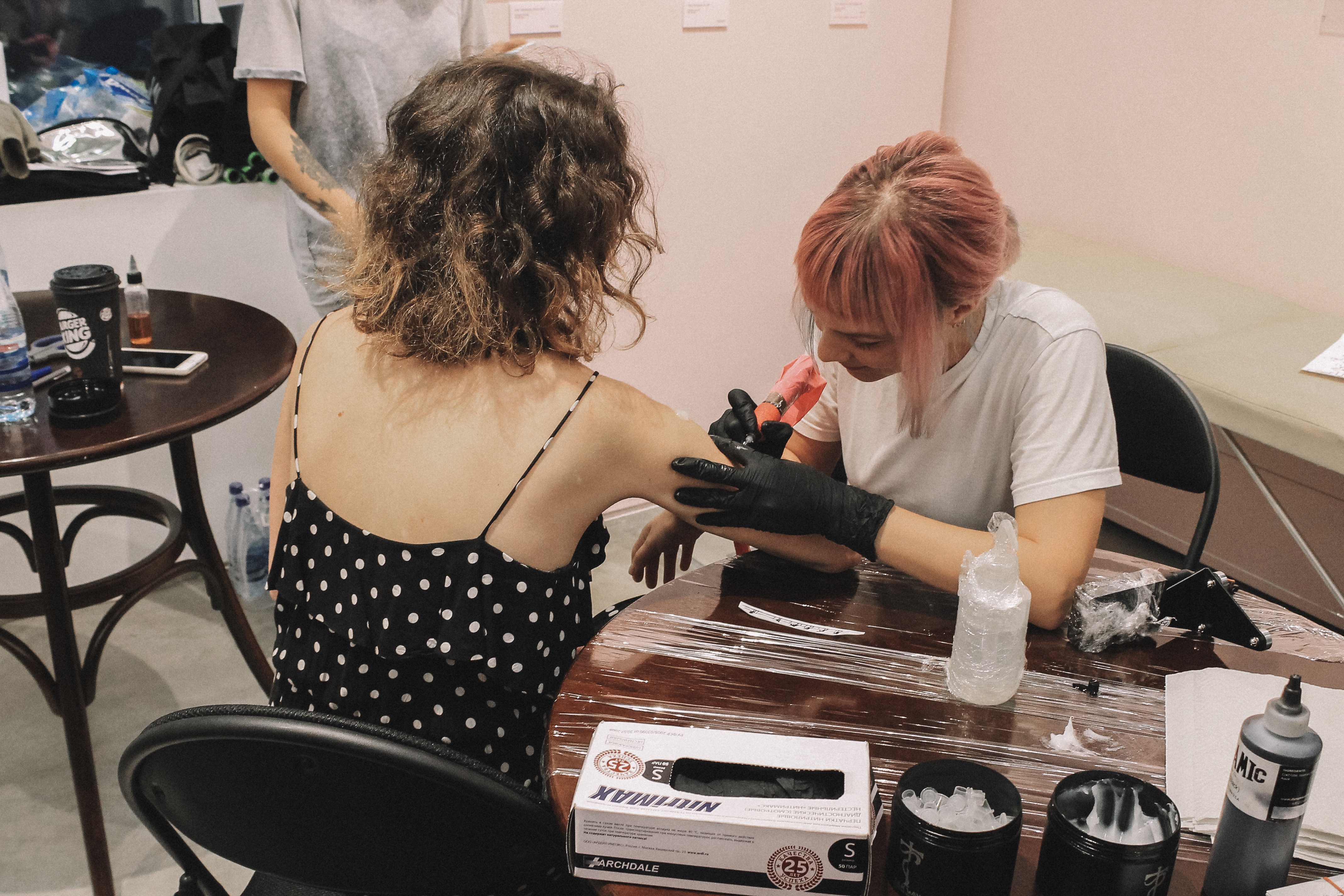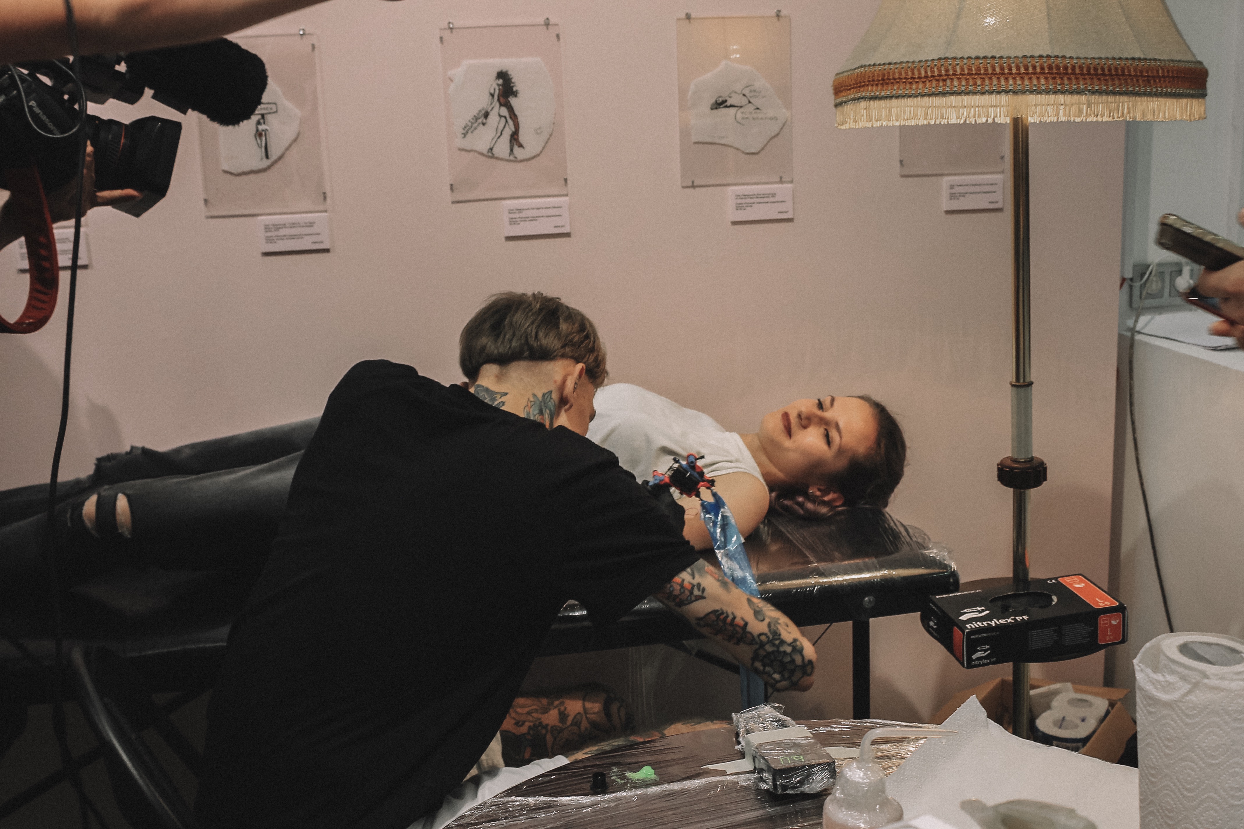 На выставке можно не только посмотреть эскизы, но и запечатлеть их на своем теле. Для этого приглашены три тату-мастера и расставлены кушетки. "Бить татуировки во время таких мероприятий для нас стало уже традицией. Мы делали это на вечеринках, пока Олег еще сидел. Сам процесс набивания татуировки – это знаковая вещь для нашего проекта TRAP: Tattoos from RussiAn Prison, так как он полностью построен вокруг этого. Наша выставка – это ведь передвижная галерея на телах. В этом вся суть проекта. На мероприятиях мы эту галерею пополняем", – говорит Акимов.