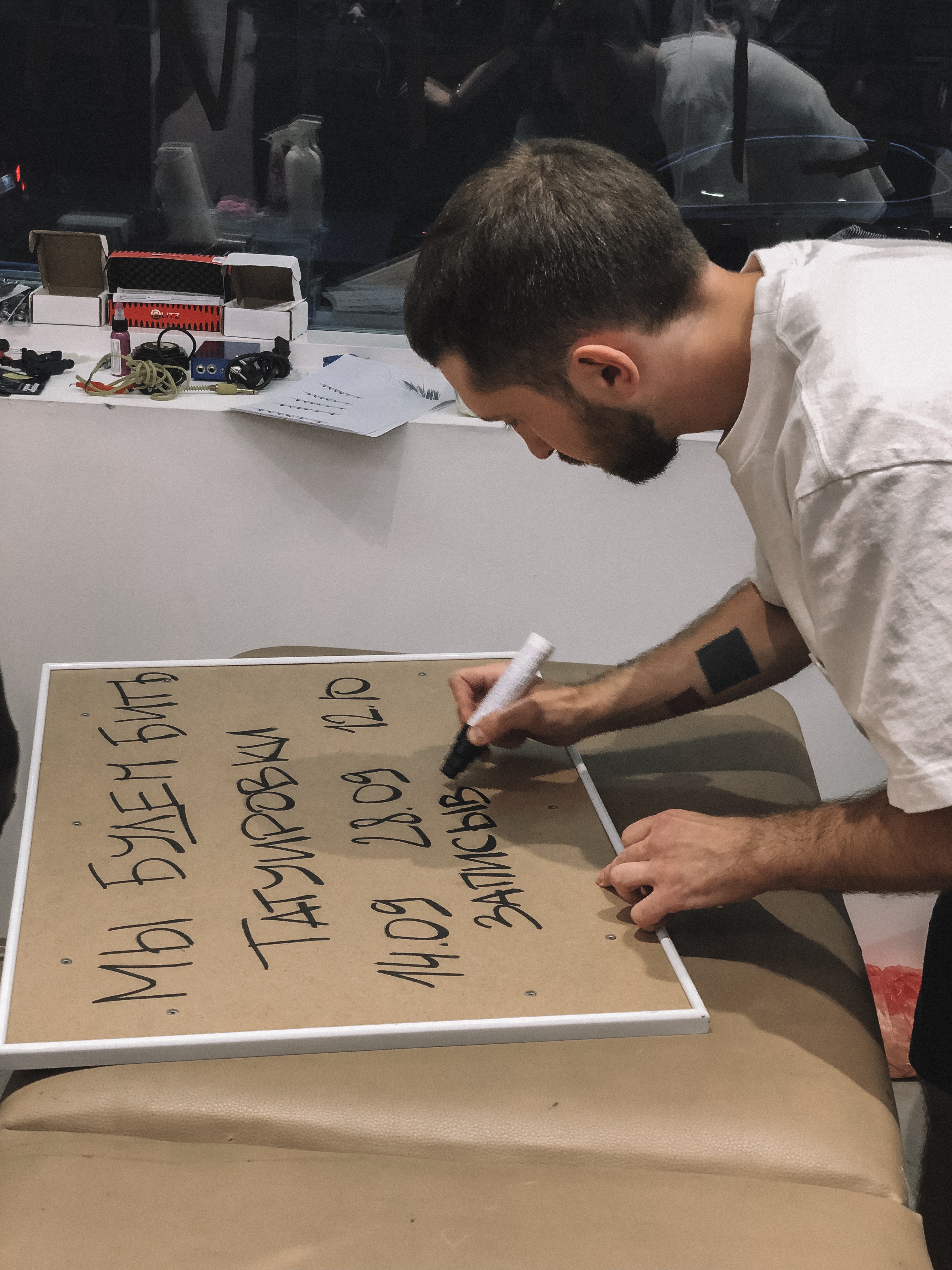 Желающих набить татуировку по эскизам Олега Навального оказалось много, поэтому организаторы объявили запись. В итоге за первый день каждый мастер создавал около четырех картинок.