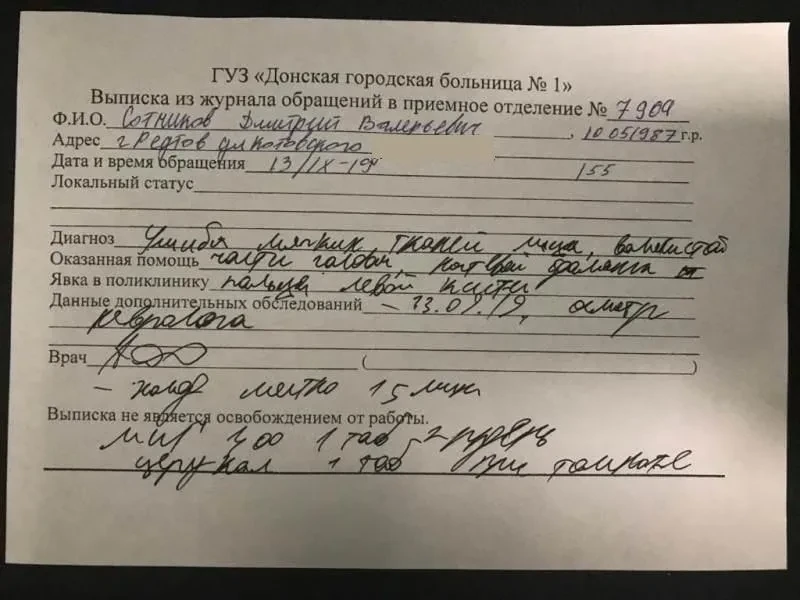 «Приехал патруль, меня спустили на первый этаж, через два часа приехал следователь — тогда с меня, наконец, сняли наручники. Следователь меня опросил, повез снимать побои», — рассказывает Сотников, уточняя, что в травмпункте у него зафиксировали травму лица, ушиб уха и ушиб плеча.