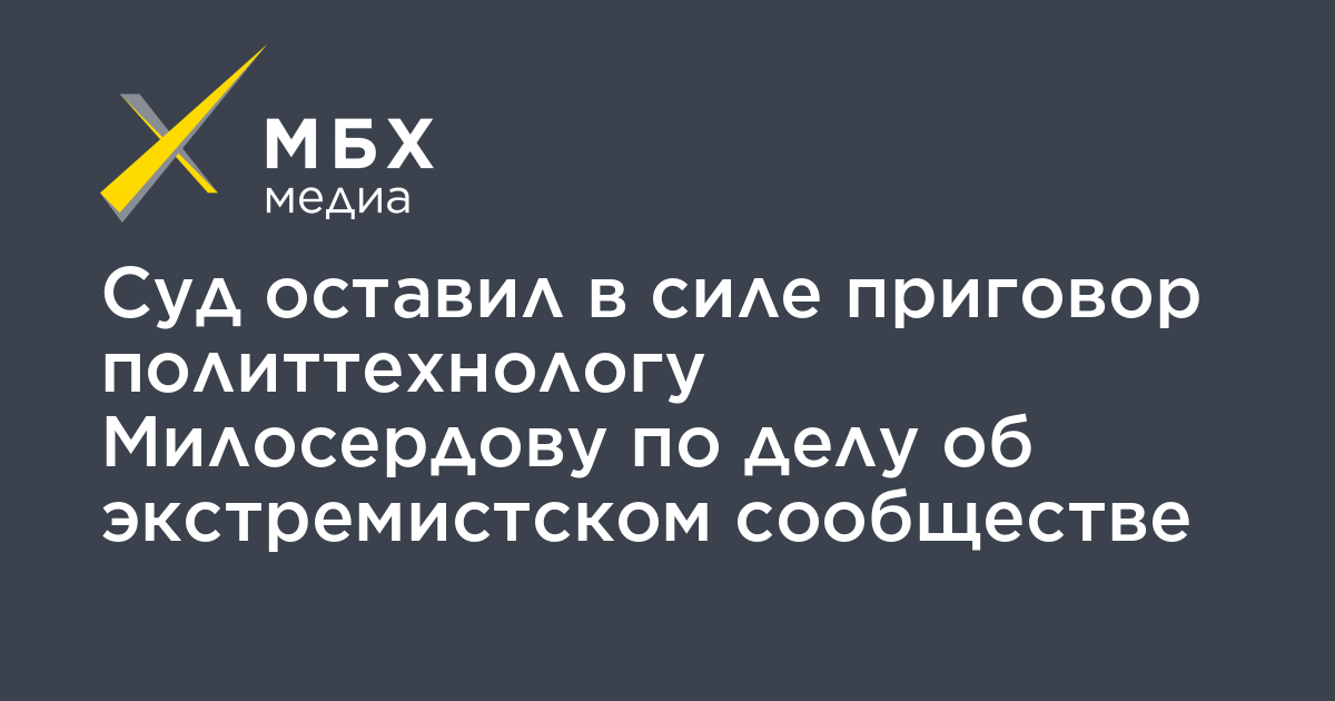 Мосгорсуд оставил в силе приговор политтехнологу Петру Милосердову, которому дали 2,5 года колонии общего режима по делу об экстремистском сообществе, сообщает корреспондент «МБХ медиа».