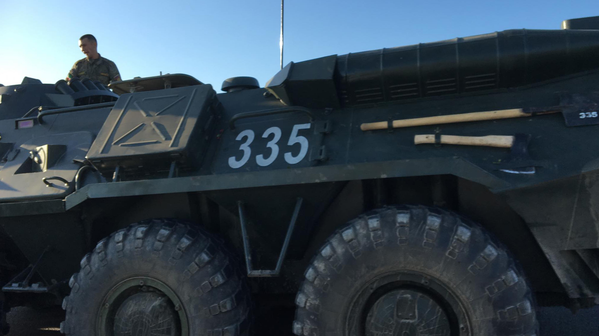 БТР ударил сзади легковой автомобиль, который врезался в военный грузовик. В итоге вся колонна военной техники вынуждена была остановиться, что еще больше затруднило движение по трассе.