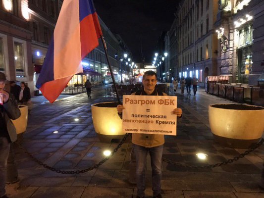 Всех троих задержали на пересечении Малой Садовой улицы и Невского проспекта. На плакатах пикетчиков значились лозунги за свободу политзаключенных, в поддержку ФБК и про деньги Беглова (губернатора Санкт-Петербурга).