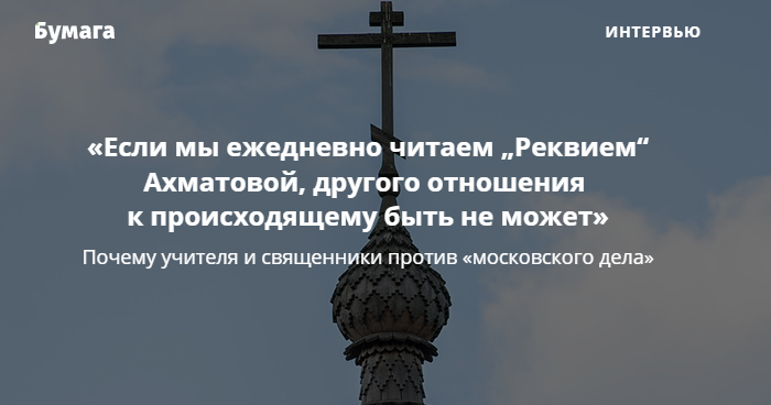 Не знаю, почему выступить решили именно учителя и священники. Наверное, учителя много проводят времени с детьми и осознают свою ответственность за их будущее. А священники, может быть, особо сильно ощущают связь своего дела с тем, какие моральные устои существуют в обществе. Но повторюсь, что в поддержку участников «московского дела» выступают вообще все — дело не в профессии.